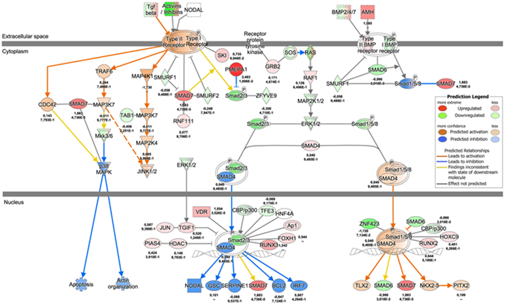 TGF-β signaling pathway map 72 h dyn vs. 72 h stat condition. Network depicting the regulation of TGF-β signaling cascade at 72 h, as represented by IPA. The values underneath each protein (when expressed in the dataset) indicate respectively the logFC and the adjusted p-value from the DE analysis between 72 h dyn and 72 h stat.