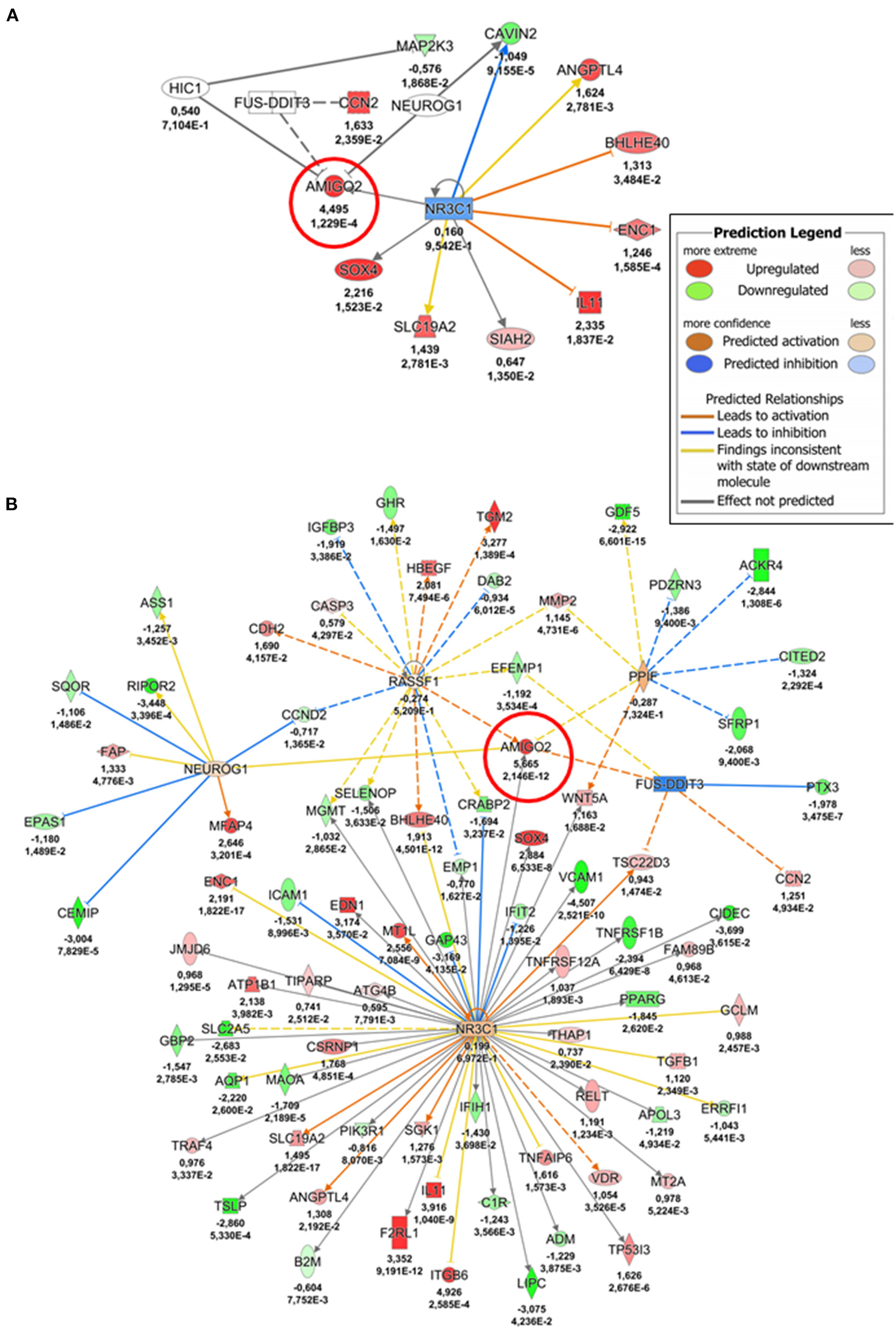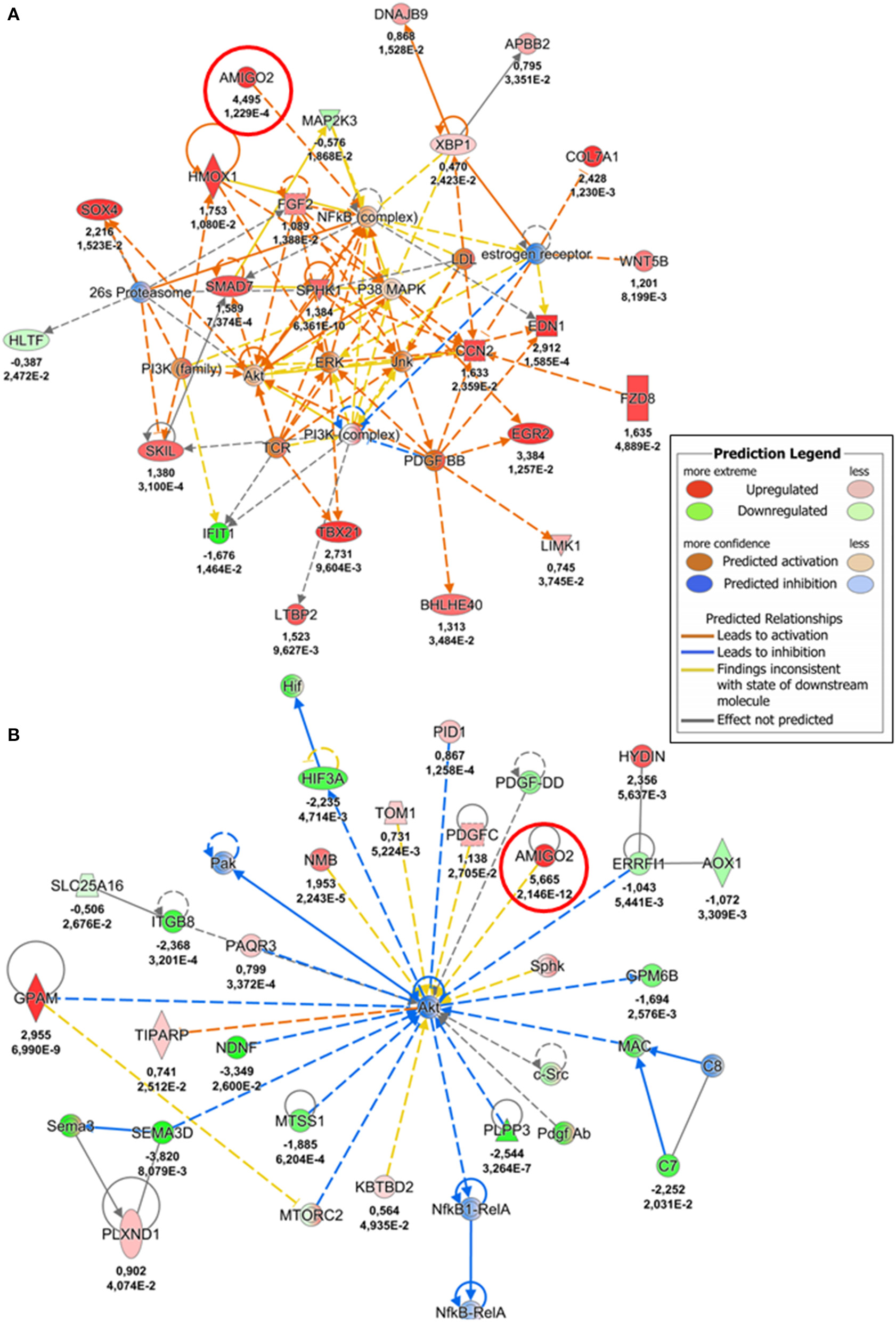 AMIGO2 upstream regulators-gene interaction networks. (A) Network depicting AMIGO2 upstream regulators predicted activity at 24 h (24 h dyn vs. 24 h stat). (B) Network depicting AMIGO2 upstream regulators predicted activity at 72 h (72 h dyn vs. 72 h stat). The values underneath each gene (when expressed in the dataset) indicate respectively the logFC and the adjusted p-value from the DE analysis. AMIGO2 is circled in red.