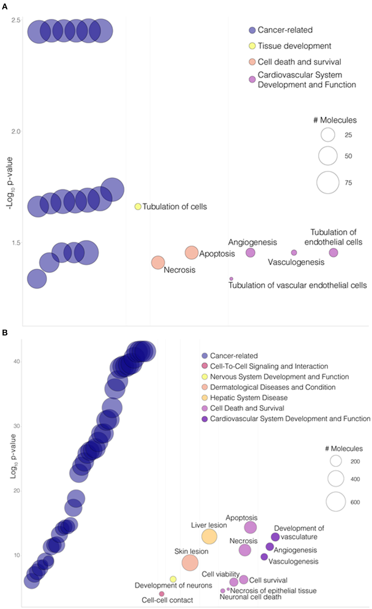 To gain further insight into mechanical strain-associated changes in SVPs in relation to AMIGO2 we analyzed the human protein-protein interaction networks by IPA (Figures 7A,B). In the 24 h dyn vs. 24 h stat comparison, AMIGO2 was found connected to NFkB complex which was predicted up-regulated by the modulation of DEGs present in the network. After 72 h of culture, the specific modulation of several genes, including AMIGO2, suggested an interaction with Akt, which was predicted to be inhibited as a result of the stretch-dependent changes in the transcriptional profile of SVPs. This finding was in contrast with what has been reported in AMIGO2's activation mechanism in endothelial cells (ECs) (36), and suggests that in SVPs AMIGO2 could operate through different pathways, independent of PDK-Akt. Next, the effect of mechanical strain on the molecular and cellular functions of SVPs has been closely examined via Gene Ontology (GO) analysis of the 24 h dyn vs. 24 h stat and 72 h dyn vs. 72 h stat conditions. Table 4 shows the top 5 enriched pathways involving AMIGO2. The topmost function in SVPs stretched cells was cell-matrix adhesion (p-value 7.72 × 10−10), along with chemotaxis (p-value 6.92 × 10−10) and cell-cell adhesion via plasma-membrane adhesion molecules (p-value 2.07 × 10−10), describing a potential switching of the SVPs phenotype toward migration. Ultimately, diseases and biological function-related pathways involving AMIGO2 were obtained through IPA (Figures 8A,B). We observed an increase in the number of functions identified prolonging mechanical stress from 24 to 72 h. For example, the Cell Death and Survival macro-category after 24 h addressed only the regulation of apoptosis and necrosis, but after 72 h we also detected activation of cell viability and cell survival pathways. Of note, the cancer-related biofunctions were the most associated with AMIGO2 at both time points, reflecting its potential role in tissue invasion and remodeling (34, 35, 37, 38). Thus, the investigations performed with iRegulon and IPA as well as the AMIGO2-related GO findings shed a light on how mechanical stress could produce a phenotypic switching in the SVPs, mediating their activation and increasing their responsiveness to modifications occurring in the extracellular environment.