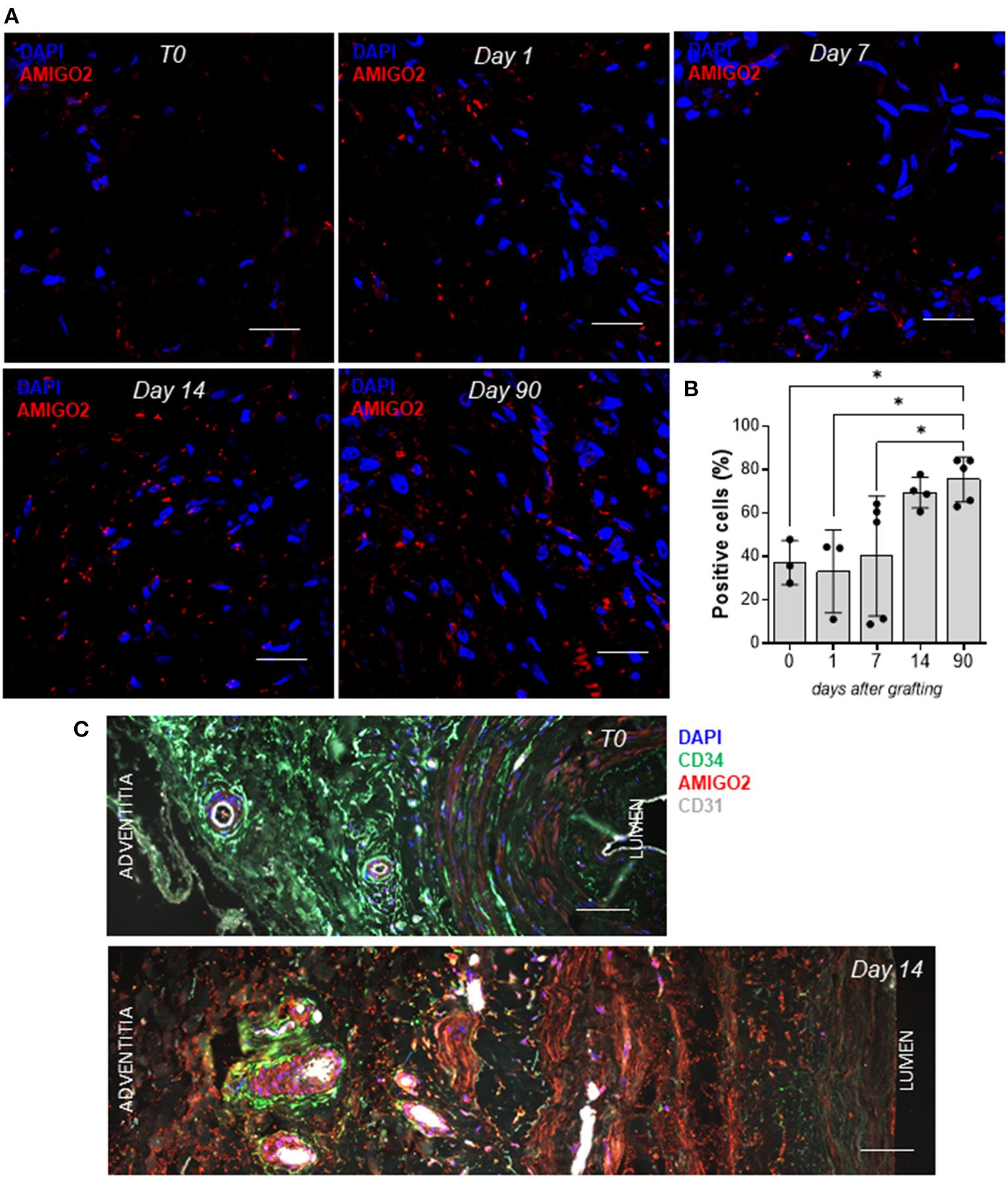 The animals were subjected to unilateral or bilateral autologous saphenous vein (SV) into common carotid artery bypass grafting. In brief, pigs were anesthetized with ketamine (Ketaset, 100 mg/mL), intubated, and maintained on 1–3% halothane under spontaneous ventilation. The animal was heparinized by intravenous administration of 100 IU/kg of heparin. The long saphenous vein was harvested from the hind leg using the “no touch” technique (29), rinsed in a saline solution containing 2 IU/ml heparin and 50 μg/ml glyceryl trinitrate, and stored in the same solution at room temperature until needed. A 3-cm length of the vein was placed as an interposition graft to the internal carotid artery using continuous 7/0 Surgipro sutures. The flow was re-established and checked using a hand-held Doppler flow meter (Multidoplex II (model MD2), Huntleigh Diagnostics Ltd, Cardiff, UK), and the animals were given antibiotic (ampicillin) and analgesic (buprenorphine) before and during recovery. The pigs were anesthetized and the SV grafts were collected at the established time points (1, 3, 7, 14, and 90 days), followed by euthanasia using an intra-cardiac overdose of pentobarbital. The grafts were fixed in 4% paraformaldehyde for 16 h and then embedded in paraffin for immunohistochemical analyses. Paraffin-embedded tissue sections were dehydrated and after blocking with 6% BSA for 1 h, incubated for 16 h at 4°C with the primary antibodies: AMIGO2 (1:100, Abcam ab84416) and α-SMA (1:150, Dako M0851) to enable the identification between the medial and adventitial layer. Subsequently, sections were incubated with appropriate secondary antibodies diluted 1:200 for1 h at room temperature. Nuclei were stained with DAPI 1μg/ml for 10 min at room temperature. Digital images were obtained using an ApoTome fluorescence microscope or LSM-710 confocal scanning microscope (both Carl Zeiss, Germany). Cells positive for AMIGO2, counted in 3 fields per section, were expressed as a percentage of cells in the whole adventitia. Measurements and quantifications were performed using ImageJ (version 1.46r, National Institutes of Health, USA). Differences between time points were analyzed in GraphPad Prism 5 using ANOVA with Newman-Keuls post hoc test, with a significance level of 0.05.
