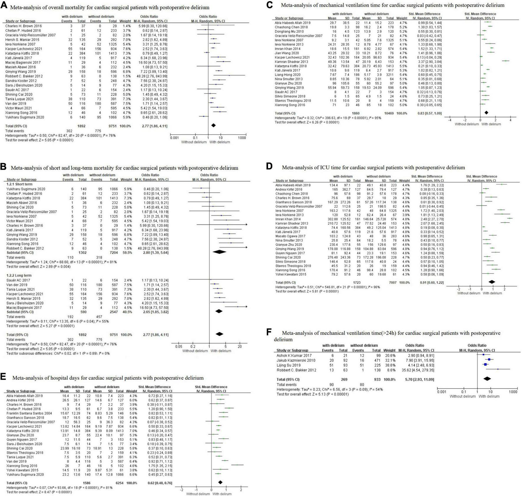 Forty-two eligible studies with 19785 patients were identified. 3368 (17.0%) patients were in the delirium group and 16417 (83%) were in the non-delirium group. The meta-analysis showed that compared to patients without POD, patients with POD had 2.77-fold higher mortality (OR = 2.77, 95% CI 1.86–4.11, P < 0.001), 5.70-fold higher MV (>24h) rate (OR = 5.70, 95% CI 2.93–11.09, P < 0.001); and longer MV time (SMD = 0.83, 95% CI 0.57–1.09, P < 0.001), ICU time (SMD = 0.91, 95% CI 0.60–1.22, P < 0.001), hospital days (SMD = 0.62, 95% CI 0.48–0.76, P < 0.001).