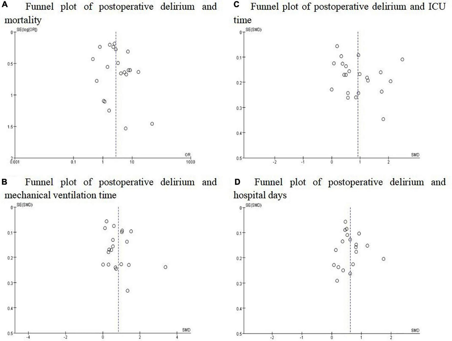 In recent years, a large body of evidence indicates that POD in patients undergoing cardiac surgery is significantly associated with poor prognosis. However, the results remain controversial. Compared with patients without POD, cardiac surgical patients who develop POD have higher mortality (9, 10). While others suggest that POD is not significantly related to mortality (11, 12). According to our literature search, only one review evaluated the association between POD and mortality in patients undergoing TAVR which was published in 2020 (13), seven studies are included and the sample size is relatively small. Individual studies have insufficient power to detect the association and to persuade convey conflicting results. Furthermore, a quantitative evaluation of the influence of POD on hospital days, ICU time, and MV time has not been performed.