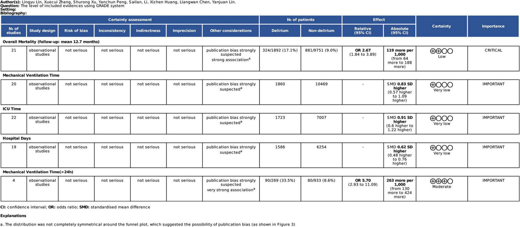 Lin L, Zhang X, Xu S, Peng Y, Li S, Huang X, Chen L and Lin Y (2022) Outcomes of postoperative delirium in patients undergoing cardiac surgery: A systematic review and meta-analysis. Front. Cardiovasc. Med. 9:884144. doi: 10.3389/fcvm.2022.884144