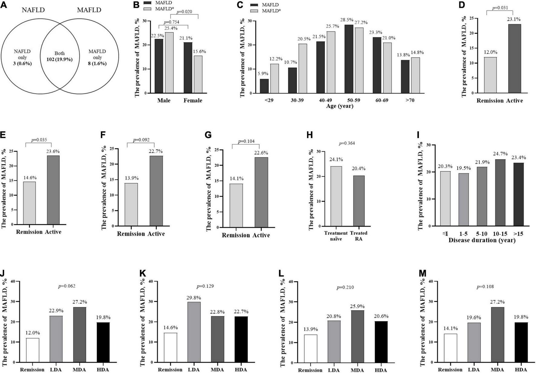 The prevalence of MAFLD increased with age, and patients with RA at the age of 50–59 years had the highest prevalence (28.5%), followed by 60–69 years (23.3%), and 40–49 years (21.5%, Figure 1C). Patients with RA at the age of 50–59 years had the highest standardized prevalence of MAFLD (27.2%), followed by 40–49 years (25.7%), and 60–69 years (21.0%, Figure 1C). The active patients with RA had a higher prevalence of MAFLD than those in remission (according to CDAI: 23.1 vs. 12.0%, Figure 1D; DAS28-CRP: 23.6 vs. 14.6%, Figure 1E; SDAI: 22.7 vs. 13.9%, Figure 1F and DAS28-ESR: 22.6 vs. 14.1%, Figure 1G), whereas there was no significant difference in MAFLD prevalence among patients with RA with low, moderate, and high disease activity (Figures 1J–M), between treatment naïve and treated patients with RA (Figure 1H), and among different disease durations (Figure 1I).