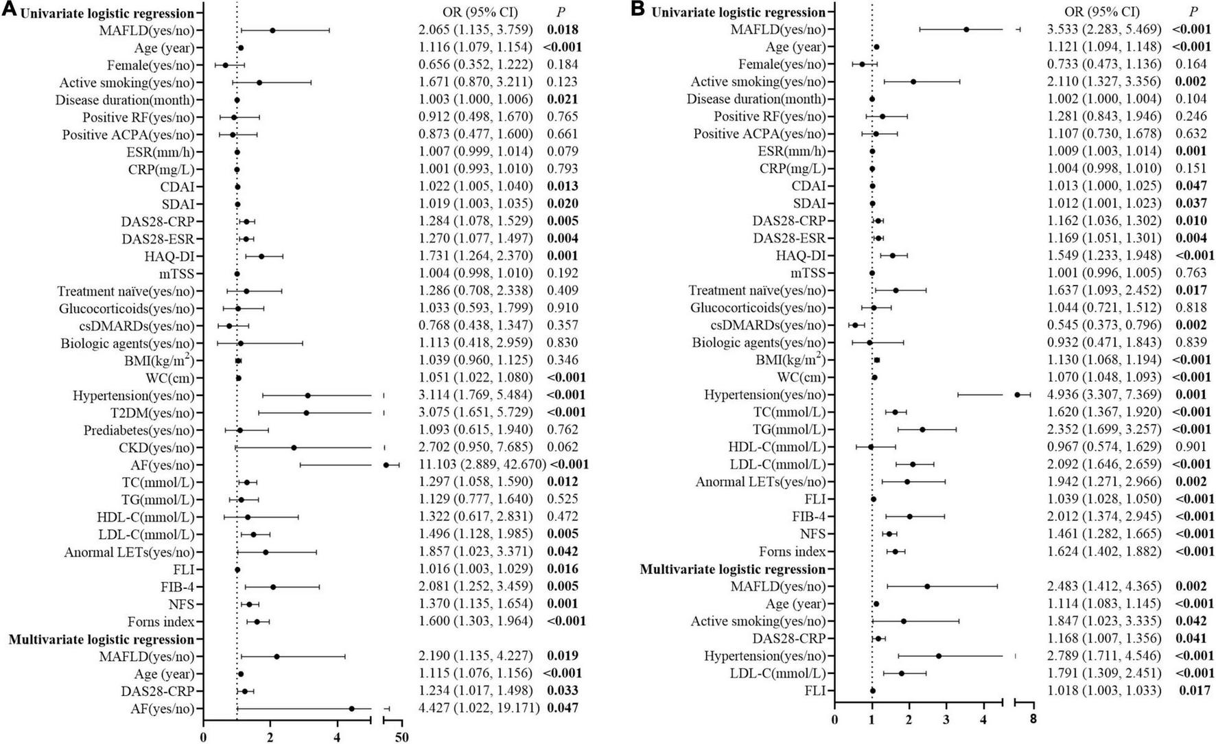 This cross-sectional study retrospectively analyzed clinical data from a Chinese RA cohort. MAFLD was diagnosed according to the criteria proposed by an international expert panel from 22 countries in 2020. CVD risk in patients with RA was estimated by the Prediction for Atherosclerotic Cardiovascular Disease Risk in China with a 1.5 multiplication factor.