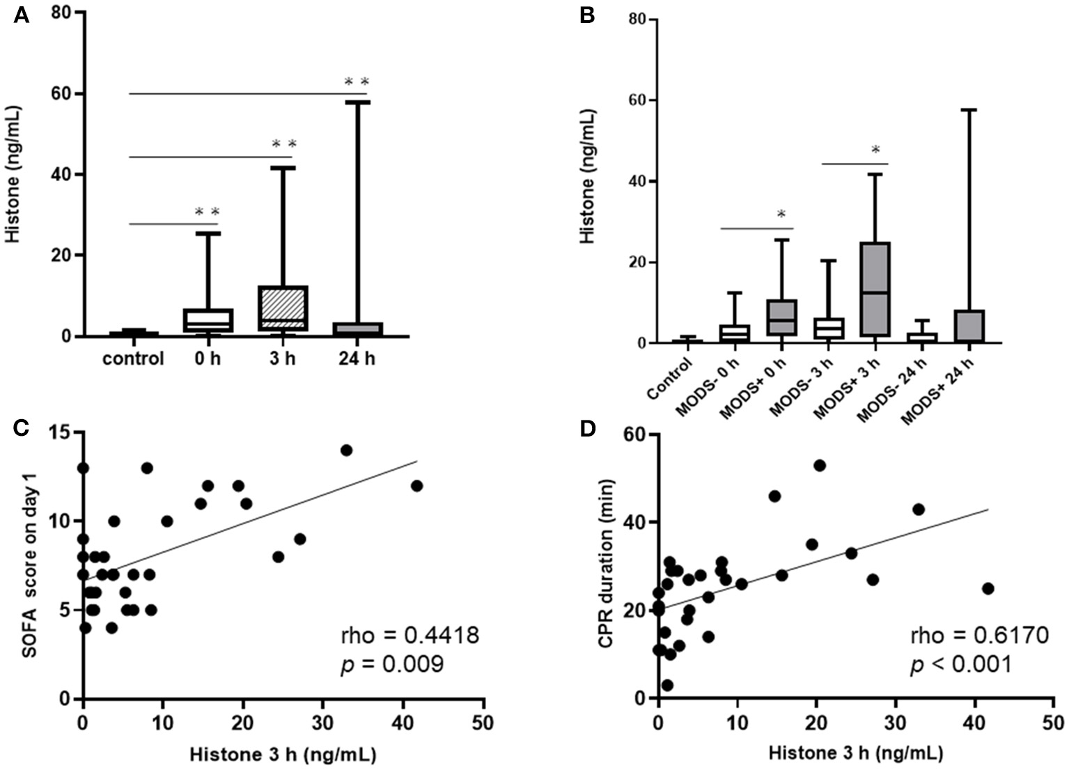 The serial changes of the plasma levels of histones and correlation between the levels of histones at 0 h and SOFA score on day 1 and CPR duration. (A) Serial change of the plasma levels of histones. (B) Changes in the plasma levels of histones in the MODS and non-MODS groups. (C) Correlation between the plasma levels of histones at 3 h and SOFA score on day 1. (D) Correlation between plasma levels of histones at 3 h and CPR duration. *p < 0.05, **p < 0.001. CPR, cardiopulmonary resuscitation; MODS, multiple organ dysfunction syndrome; SOFA, Sequential Organ Failure Assessment.