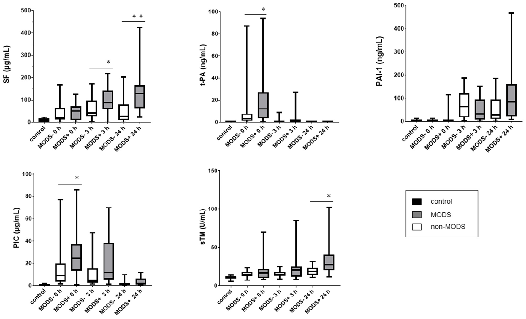 The serial changes of coagulofibrinolytic molecular makers in the MODS and non-MODS groups. *p < 0.05, **p < 0.01. MODS, multiple organ dysfunction syndrome; PAI-1, plasminogen activator inhibitor-1; PIC, plasmin-alpha 2-plasmin inhibitor complex; SF, soluble fibrin; sTM, soluble thrombomodulin; t-PA, tissue-type plasminogen activator.