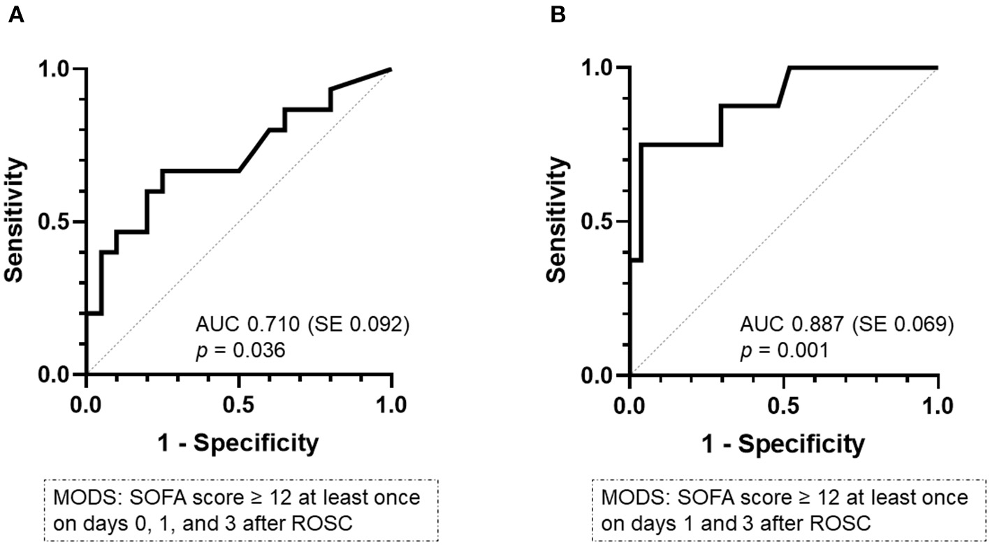 Receiver-operating characteristics curve analysis of the plasma level of histones at 0 h on predicting MODS. (A) MODS was defined as a SOFA score of ≥12 at least once on days 0, 1, and 3 after ROSC. (B) MODS was defined as a score of ≥12 at least once on days 1 and 3 after ROSC. AUC, area under the curve; MODS, multiple organ dysfunction syndrome; ROSC, return of spontaneous circulation; SE, standard error.