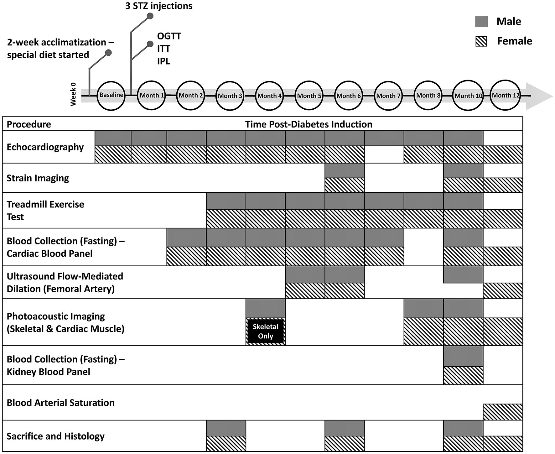 Timeline of diabetes induction and post-induction monitoring and assessment. Additional measurements not shown include weekly weight, non-fasting blood glucose, and monthly blood pressure measurements. STZ, streptozotocin; OGTT, oral glucose tolerance test; ITT, insulin tolerance test; IPL, insulin plasma level