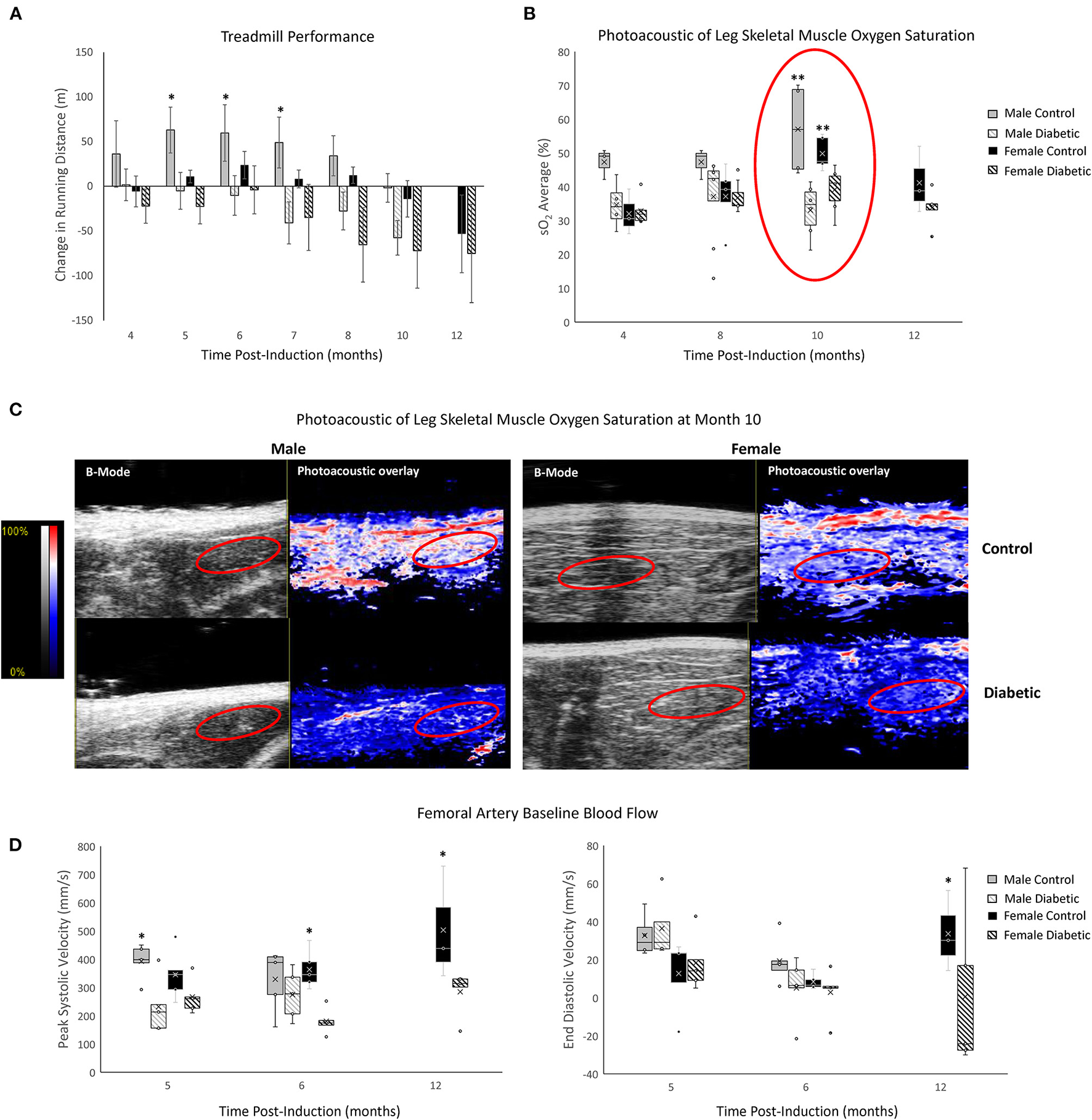 Non-invasive evaluation of skeletal muscle microvasculature dysfunction. (A) Treadmill exercise tolerance testing. The change in running distance relative to Month 3 in individual rats is averaged for each cohort. Significance between male or female control/diabetics across all timepoints was found at p = 0.0024 and p = 0.0353, respectively. Animal numbers at 3 and 4 months (n = 8 control male, n = 17 diabetic male, n = 8 control female, and n = 12 diabetic female), 5 and 6 months (n = 8 control male, n = 12 diabetic male, n = 7 control female, and n = 12 diabetic female), 7 and 8 months (n = 6 control male, n = 9 diabetic male, n = 5 control female, and n = 9 diabetic female), 10 months (n = 6 control male, n = 8 diabetic male, n = 5 control female, and n = 9 diabetic female), and 12 months (n = 3 control female, and n = 5 diabetic female). (B) Tissue oxygen saturation in leg skeletal muscle from photoacoustic imaging at 4 months (n = 3 control male, n = 4 diabetic male, n = 3 control female, and n = 6 diabetic female), 8 months (n = 3 control male, n = 8 diabetic male, n = 5 control female, and n = 7 diabetic female), 10 months (n = 4 control male, n = 6 diabetic male, n = 5 control female, and n = 6 diabetic female), and 12 months (n = 3 control female and n = 5 diabetic female) post-induction. (C) Photoacoustic ultrasound images of skeletal muscle at 10 months post-induction. Greyscale images are B-Mode images, and colormaps are the photoacoustic tissue oxygenation saturation overlay. (D) Baseline measurements from the femoral artery for peak systolic velocity and end-diastolic velocity measured at month 5 (n = 5 for each of control male, diabetic male, control female, and diabetic female), month 6 (n = 5 for each of control male, diabetic male, control female, and diabetic female), and month 12 (n = 3 control female and n = 5 diabetic female) post-induction. Boxplot mean value is represented with the symbol “X.” Significance at individual timepoints between control and diabetic cohorts of the same sex is indicated (*p < 0.05), (**p < 0.01). Data represented as mean ± SEM.