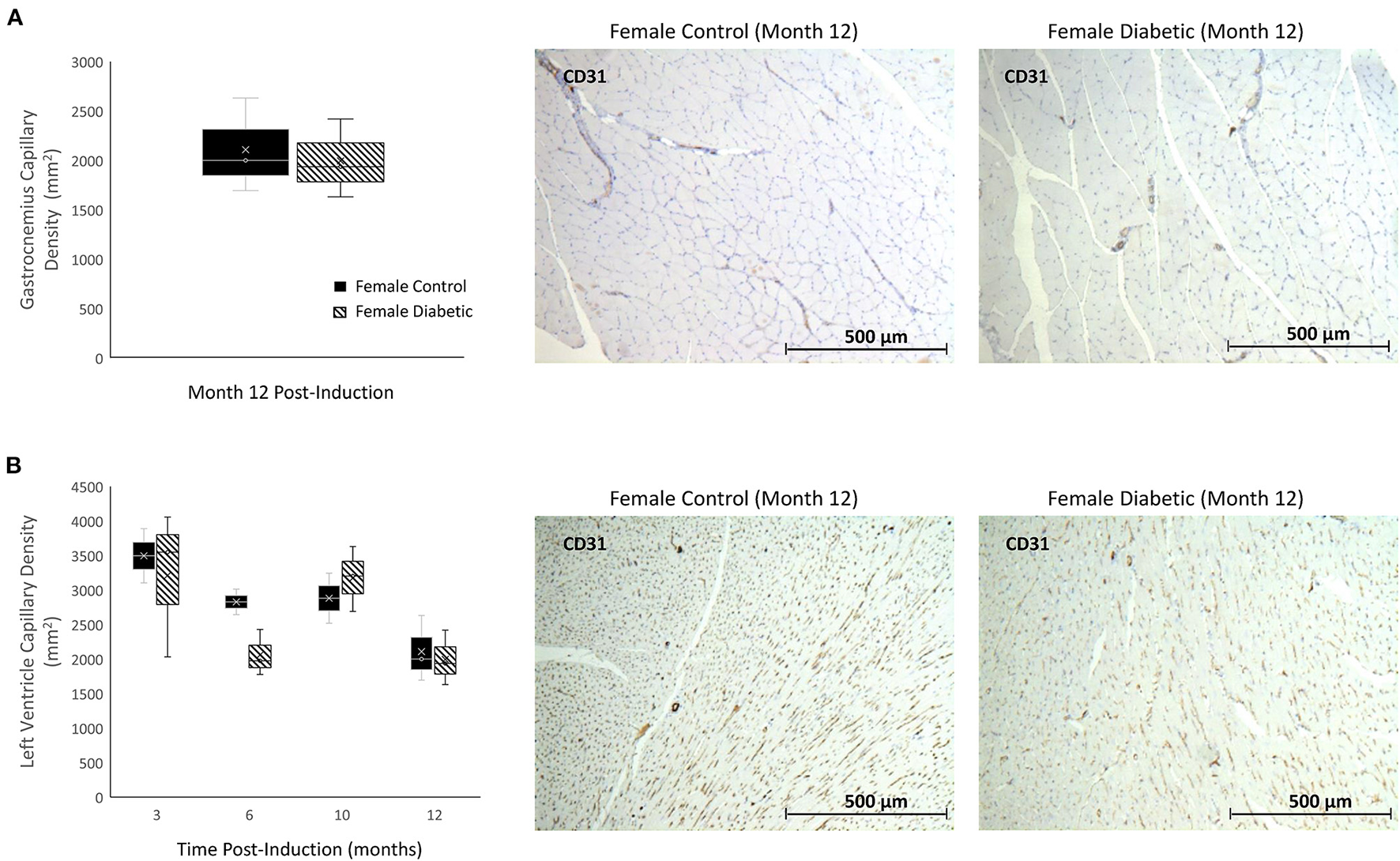 Histology of skeletal and myocardial muscle capillary density reveals no rarefaction. Timepoints refer to time post-induction at 3 months (n = 2 control female and n = 3 diabetic female), 6 months (n = 2 control female and n = 3 diabetic female), 10 months (n = 2 control female and n = 3 diabetic female), and 12 months (n = 3 control female and n = 3 diabetic female) post-induction. Gastrocnemius (A) and myocardial muscle (B) capillary density quantified as the number of microvessels per mm2 of tissue on CD31 stained sections. Representative images of skeletal and cardiac sections stained for CD31 from female control (middle) and diabetic (right) rats at 12 months post-induction. Boxplot mean value is represented with the symbol “X.” Results for male rats are shown in reference (8).