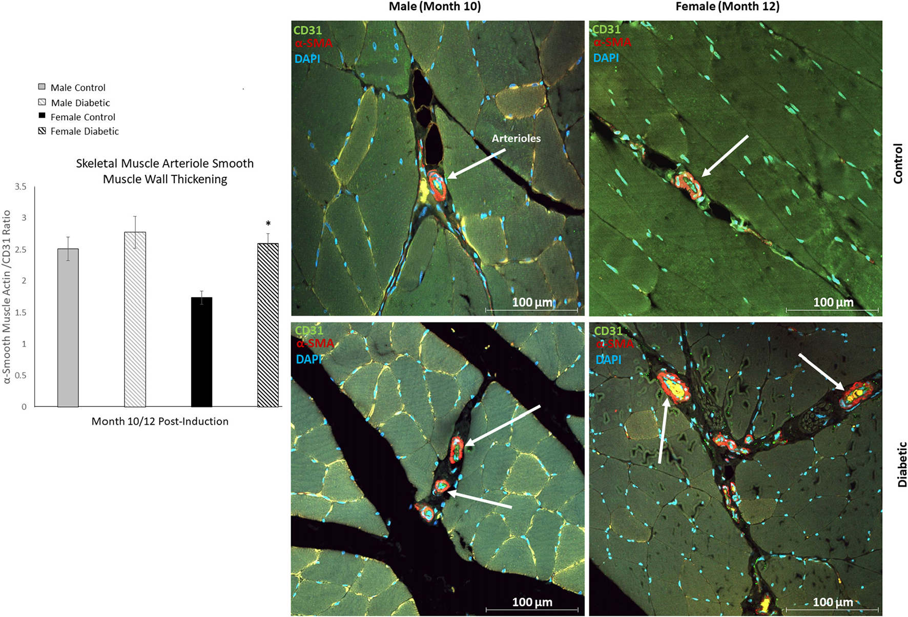 Immunofluorescence of small arteriole perivascular smooth muscle wall in leg skeletal muscle shows thickening in diabetic females. Quantification expressed as a ratio of surface area coverage of αSMA to CD31 for each arteriole (10–25 μm). Assessment conducted at 10 and 12 months post-induction for males and females, respectively (n = 3 control male, n = 4 diabetic male, n = 3 control female and n = 4 diabetic female). White arrows highlight representative arterioles from each cohort. Significance between control and diabetic cohorts with their respective sex is indicated (*p < 0.05). Data represented as mean ± SEM.