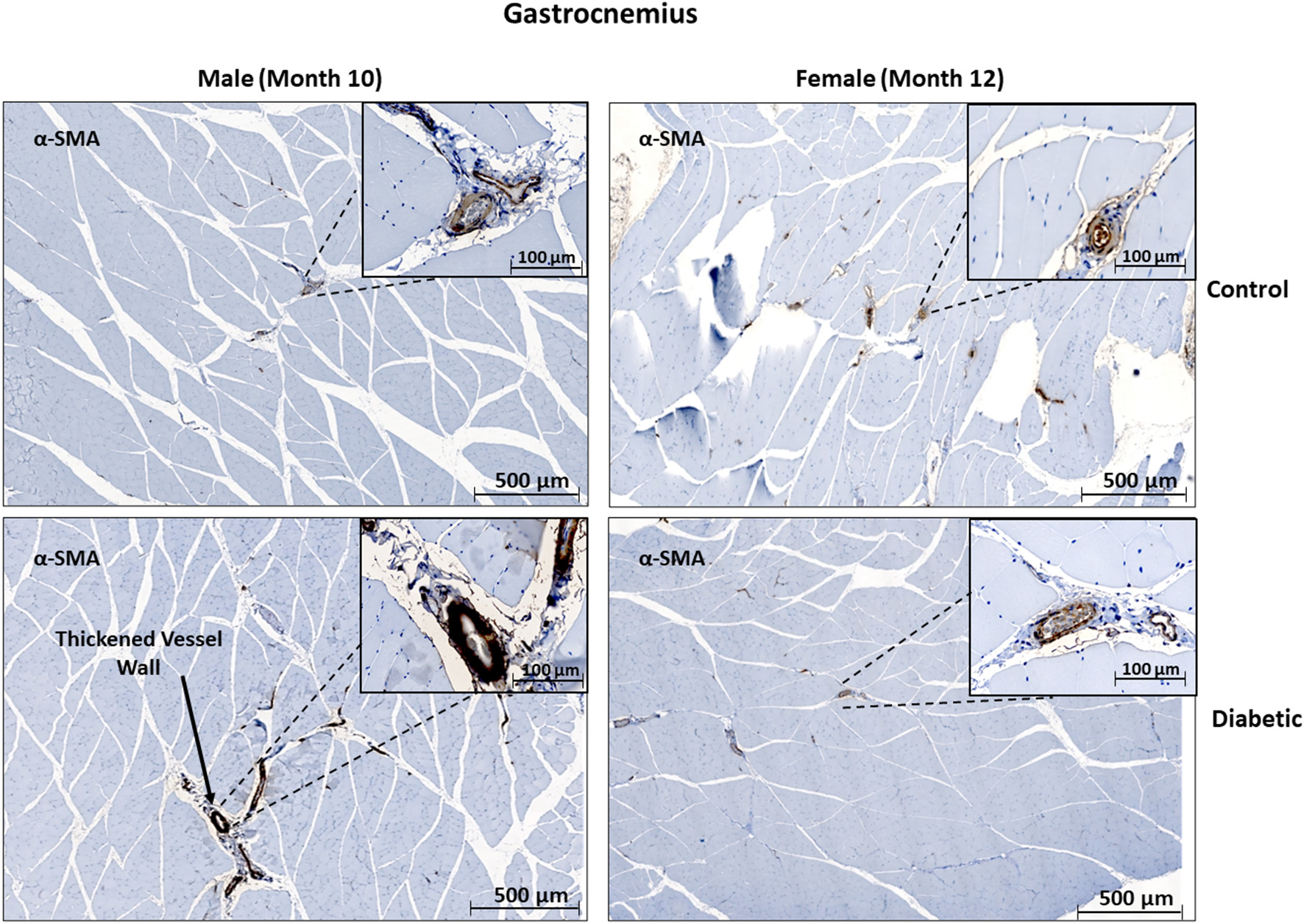 Histology of large arteriole perivascular smooth muscle wall in leg skeletal muscle shows thickening in diabetic males. Representative images of gastrocnemius skeletal muscle sections stained with αSMA in males at 10 months and females at 12 months post-induction. Images depict a thickened perivascular smooth muscle layer in the male diabetic cohort only.