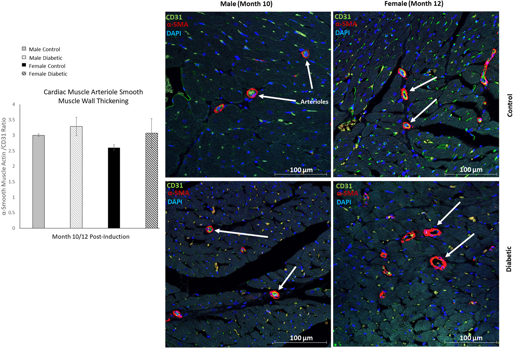Immunofluorescence of small arteriole perivascular smooth muscle wall in the myocardium shows no thickening in either sex. Quantification expressed as a ratio of surface area coverage of αSMA to CD31 for each arteriole (10–25 μm). Assessment conducted at 10 and 12 months post-induction for males and females, respectively (n = 3 control male, n = 4 diabetic male, n = 3 control female and n = 4 diabetic female). White arrows highlight representative arterioles from each cohort. Data represented as mean ± SEM.