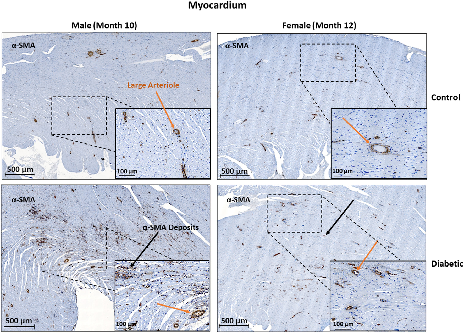 Histology of large arteriole perivascular smooth muscle wall in the myocardium shows no thickening in either sex. Representative images of LV cardiac muscle sections stained with αSMA in males at 10 months and females at 12 months post-induction. A substantial amount of myofibroblast deposits is seen in diabetic males and, to a lesser degree, in diabetic females (black arrows). No difference was observed in large arteriole smooth muscle wall thickness (orange arrows).