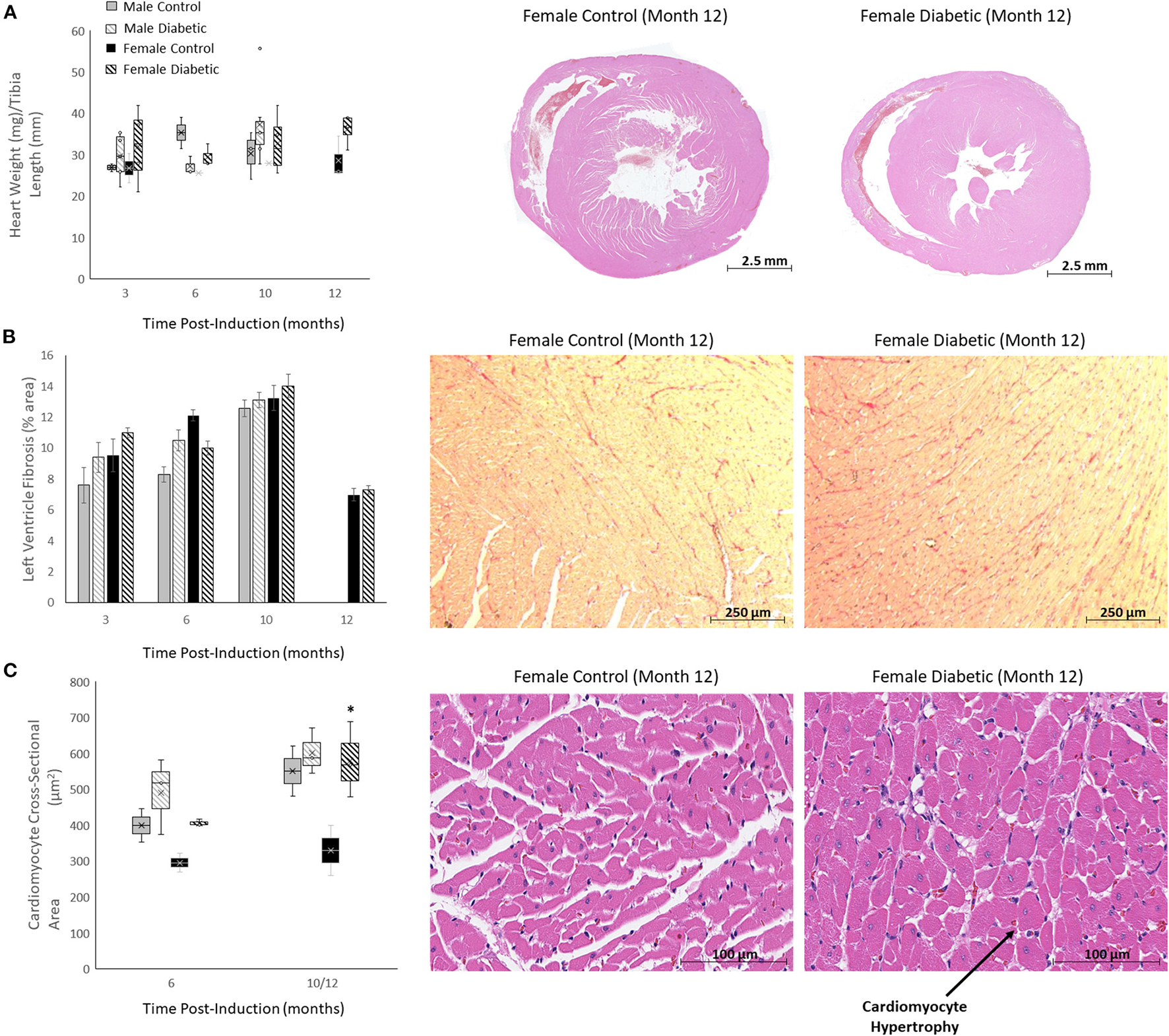 Histology of non-vascular markers in the heart. Timepoints refer to time post-induction at 3 months (n = 2 control male, n = 8 diabetic male, n = 2 control female, n = 3 diabetic female), 6 months (n = 2 control male, n = 3 diabetic male, n = 2 control female, n = 3 diabetic female), 10 months (n = 5 control male, n = 9 diabetic male, n = 2 control female, n = 3 diabetic female) and 12 months (n = 3 control female and n = 3 diabetic female). (A) Heart weight-to-tibia-length ratio (left), and H&E slide scans at 12 months post-induction of control and diabetic females (right). (B) Interstitial fibrosis quantified as percentage of collagen surface area coverage on stained heart sections (left), and representative images of control and diabetic female heart tissue stained for collagen at 12 months post-induction at 10x magnification (right). (C) Cardiomyocyte cross-sectional area quantified at 6 and 12 months post-induction (left), and representative images of control and diabetic female heart tissue stained with H&E at 12 months post-induction at 40x magnification (right). Histology images for male cohort is found in reference (8). Boxplot mean value is represented with the symbol “X.” Significance at individual timepoints between control and diabetic cohorts of the same sex is indicated (*p < 0.05). Data represented as mean ± SEM.