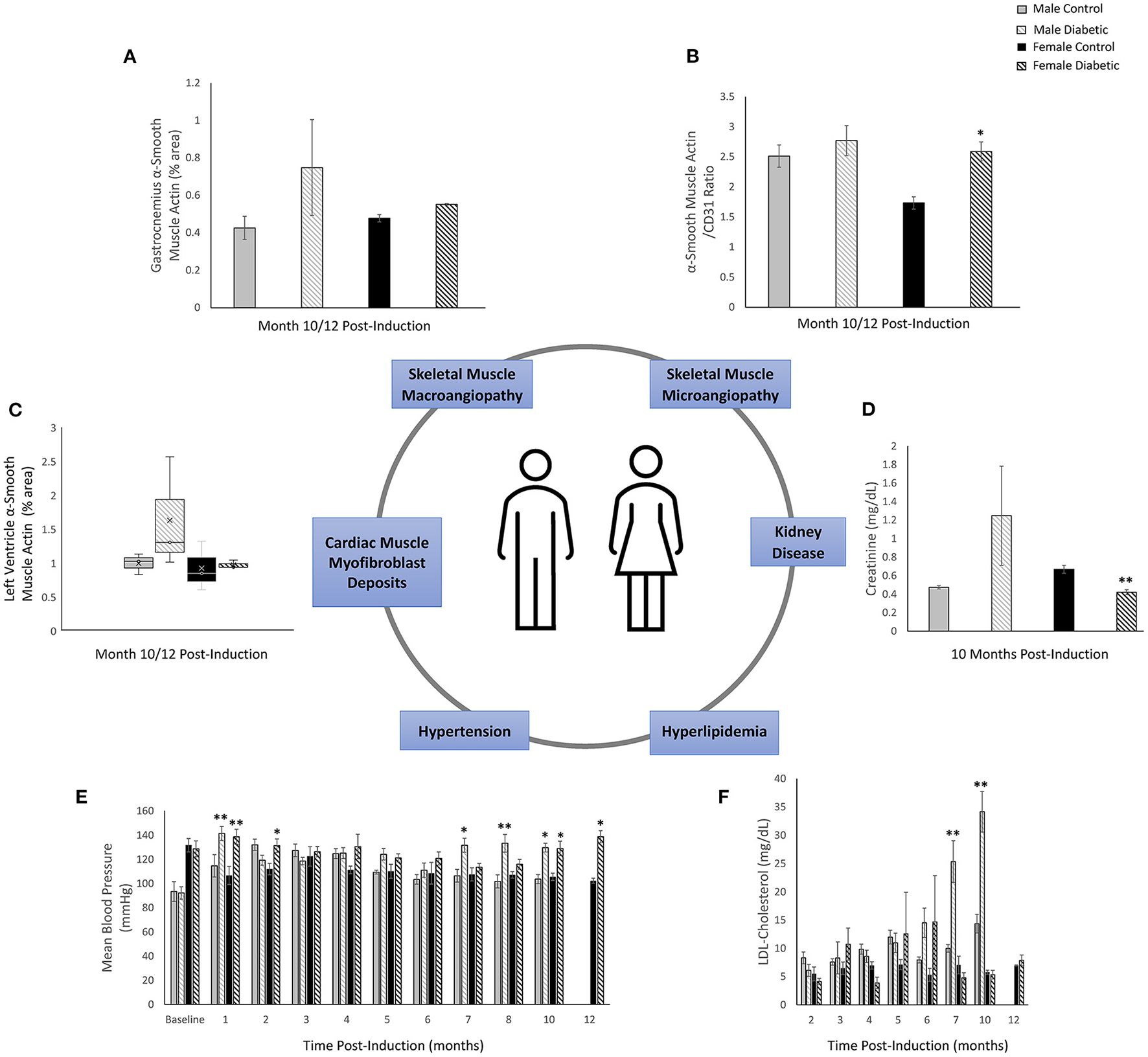Figure 9 summarizes diagrammatically the main findings on microvascular dysfunction and several biomarkers used in clinical workup (e.g., hypertension, hyperlipidemia). Sex-related differences are noted where applicable. Microvascular dysfunction underlying decreased leg skeletal muscle perfusion in diabetic males manifested as perivascular smooth muscle thickening in larger blood vessels (25–100 μm) only (Figure 9A). In diabetic females, microvascular dysfunction manifested as perivascular smooth muscle thickening in small arterioles (10–25 μm) only (Figure 9B). Perivascular smooth muscle thickening was not observed in the heart of either sex (see Section 3.2). However, staining for αSMA in the myocardium did reveal myofibroblast deposits in the LV of diabetic animals, with a higher αSMA content measured in diabetic males compared to females (Figure 9C). Chronic kidney disease evaluated through blood plasma creatinine (16) showed a non-significant elevation in male diabetic rats only. Diabetic females had significantly lower creatinine levels, an observation that has been documented previously in diabetic patients with kidney failure and poor muscle quality (17) (Figure 9D). Hypertension and hyperlipidemia, both routine biomarkers for evaluating risks for heart disease (18), presented late-stage in our diabetic cardiomyopathy model. Hypertension did not set in until Month 7 and 9 post-induction for diabetic male and female rats, respectively (Figure 9E). The transient spikes measured in the early timepoints are most likely attributed to stress from multiple STZ injections and from fasting/blood collection procedures. Significantly elevated LDL-cholesterol was observed only in diabetic males starting at Month 7; diabetic females showed no signs of hyperlipidemia at all (Figure 9F).