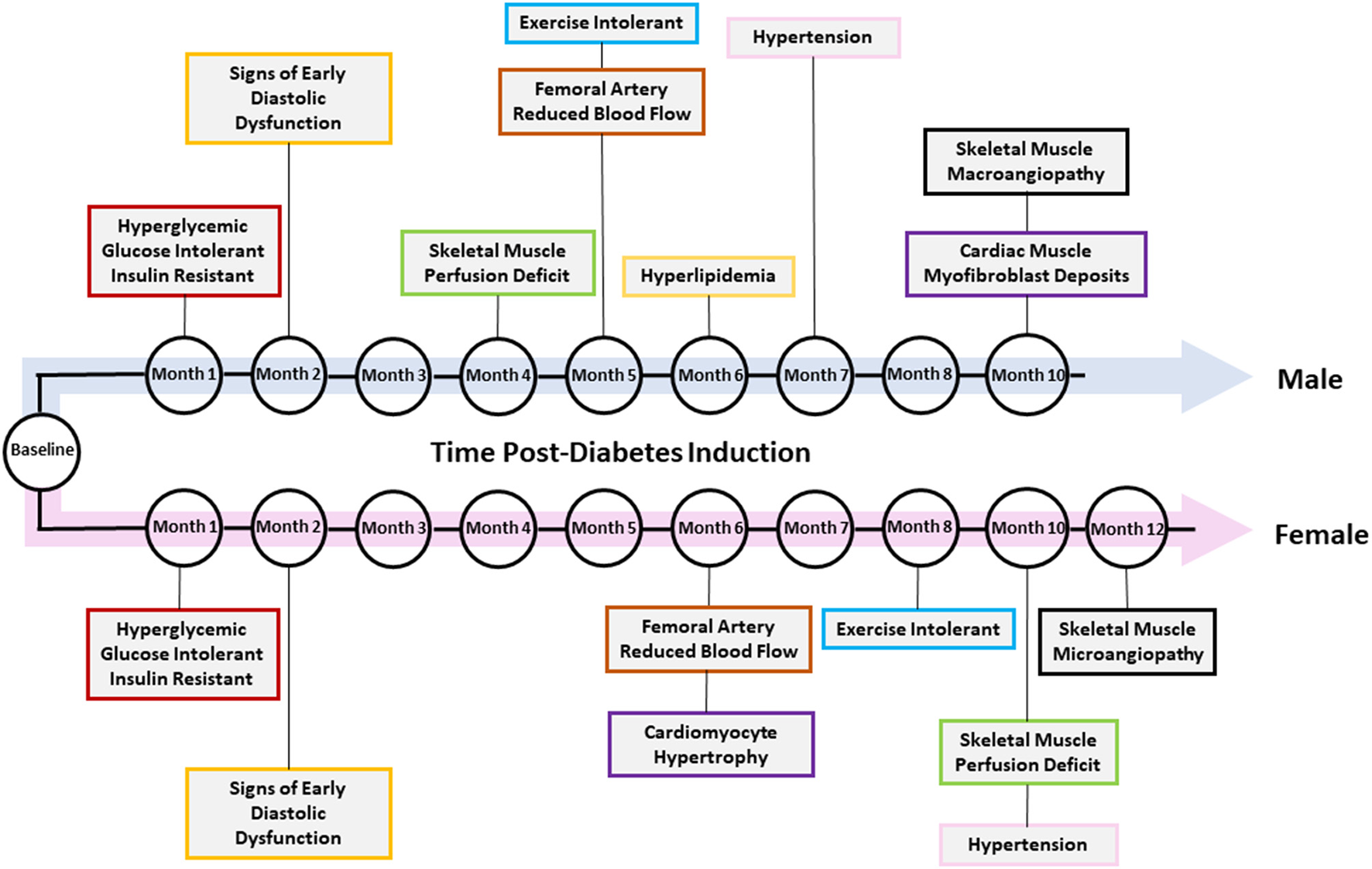 | Hyperlipidemia | HDL, LDL, and total cholesterol escalate in diabetic males, but no changes are seen in diabetic females. |