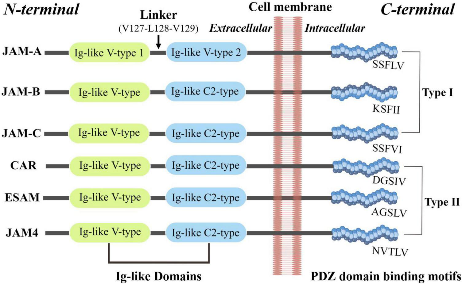 The basic structure of JAMs. JAM family proteins share common structural characteristics: a short N-terminal signal peptide, two extracellular Ig-like domains, a single transmembrane segment, and a short cytoplasmic tail with consensus phosphorylation sites and a C-terminal PDZ-binding motif (173).