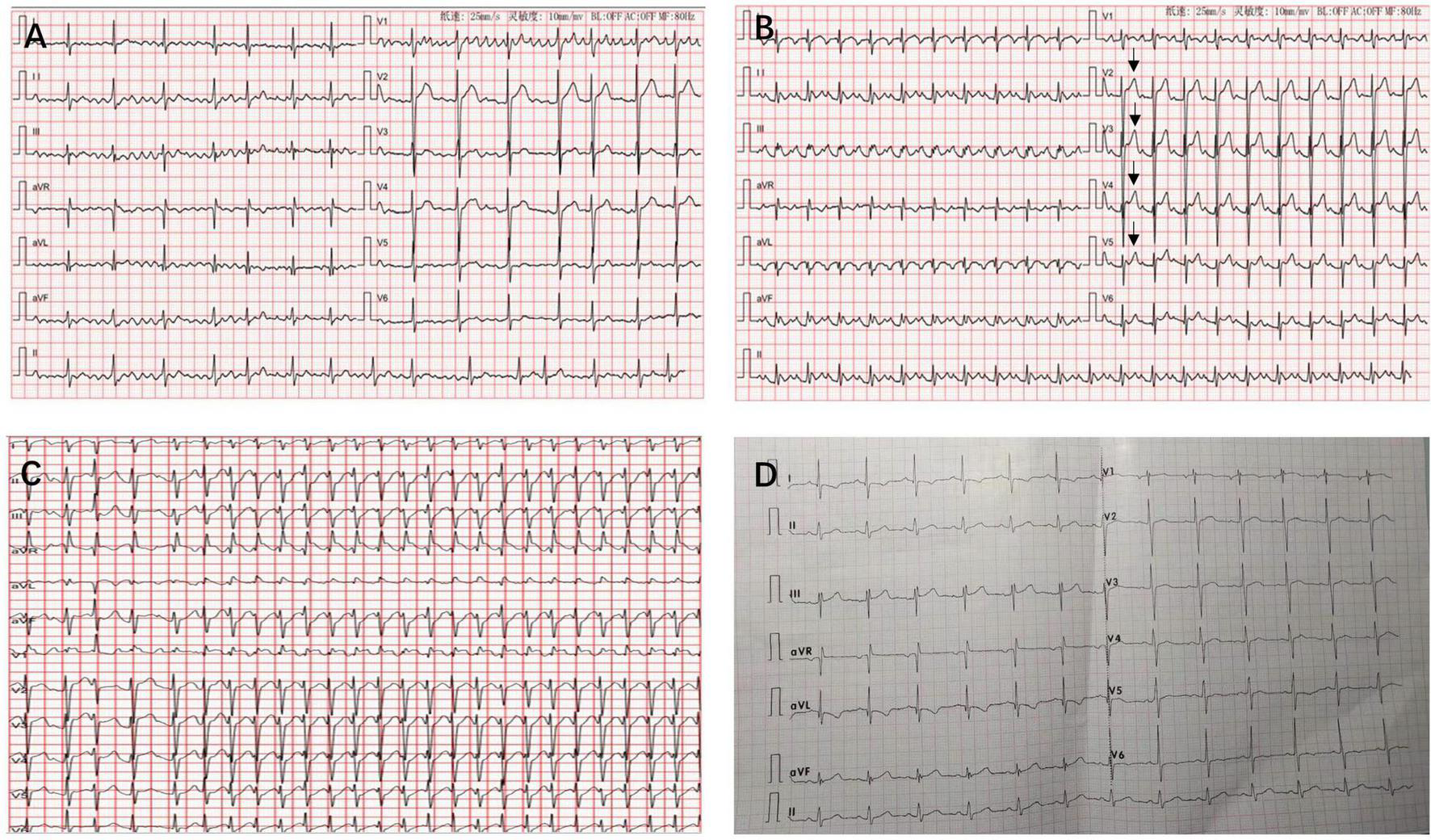 Twelve-lead electrocardiograms revealing atrial fibrillation (A), atrial flutter with mild ST-segment elevation in leads V2–V5 (arrows) (B), atrial tachycardia with a rapid ventricular rate of 238 beats/min was recorded when he was experiencing attacks of atrial tachycardia (C), and sinus rhythm at 6-month follow-up (D).