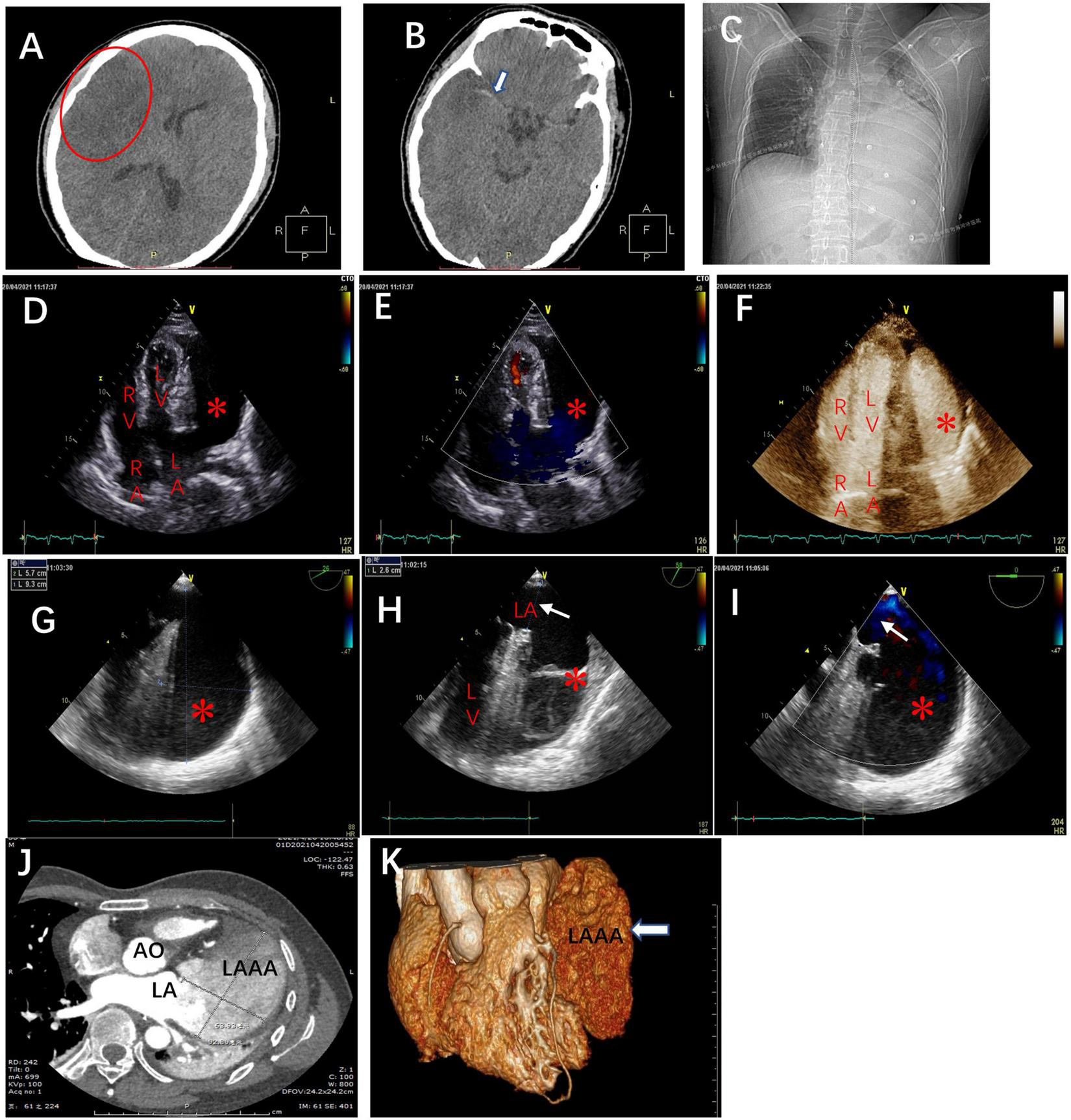 The brain computed tomography scans at admission revealed (A) massive cerebral infarction in the right-sided frontotemporal insula (red circle) and (B) the basal ganglia area with right middle cerebral artery thrombus (white arrow). (C) The chest X-ray in the cardiology department demonstrating the abnormal left heart border. Transthoracic echocardiography (TTE), apical four-chamber view (D), and the view with color doppler (E) revealing an echo-free cavity (red star) adjacent to and compressing the LV and the probable communication of the cavity with the LA; TTE with contrast showing the contrast filling in the LA and the cavity simultaneously without filling defect in the cavity (F); TEE, the mid-esophageal 2-chamber and LAA view demonstrating a giant cavity (red star) measuring 9.3 cm × 5.7 cm (G) and its connection to LA via a 2.6 cm-wide orifice (white arrow) (H) and the to-and-fro blood flows between LA and the cavity (red star) through the orifice (white arrow) (I). Axial computed tomography scan (J) and 3D reconstruction (K) demonstrate a 9.3 cm × 6.4 cm × 3.8 cm giant LAAA. AO: aorta; RA: right atrium; LA: left atrium; RV: right ventricle; LV: left ventricle.