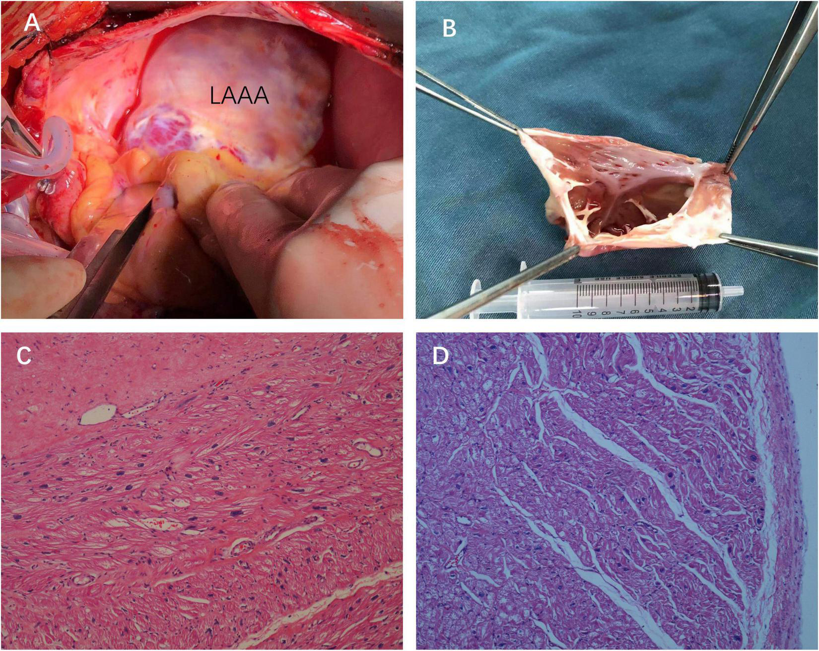 Intraoperative views (A) and the surgical specimen of the LAAA with no thrombus inside the cavity of the aneurysm (B). Hematoxylin and eosin staining of the resected left atrial appendage tissues showing the wall of the aneurysm composed of the myocardium and fibrotic tissue [(C,D), 2007×].