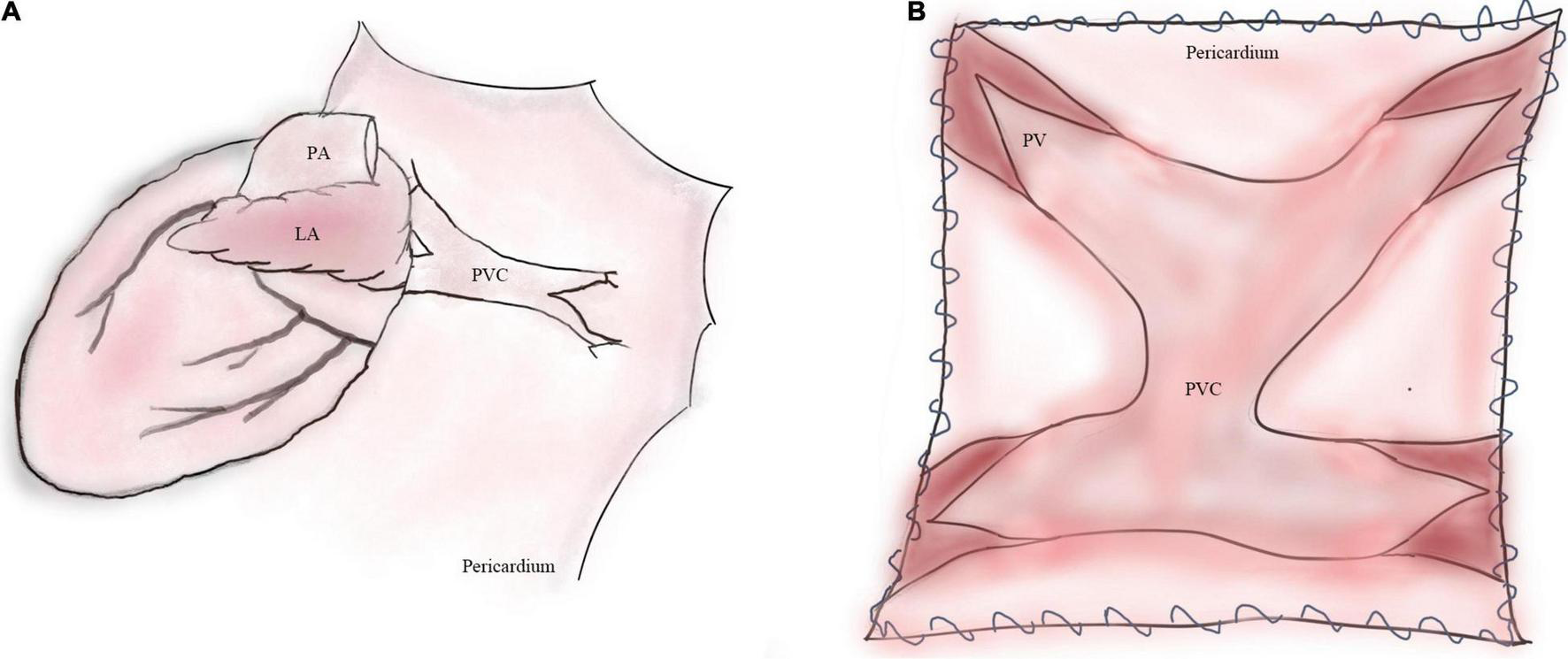 Operative illustrations of primary sutureless repair for TAPVC. (A) Illustration of TAPVC. (B) The left atrial wall is anastomosed to the posterior pericardium. LA, left atrium; PA, pulmonary artery; PVC, pulmonary venous confluence; PV, pulmonary vein.
