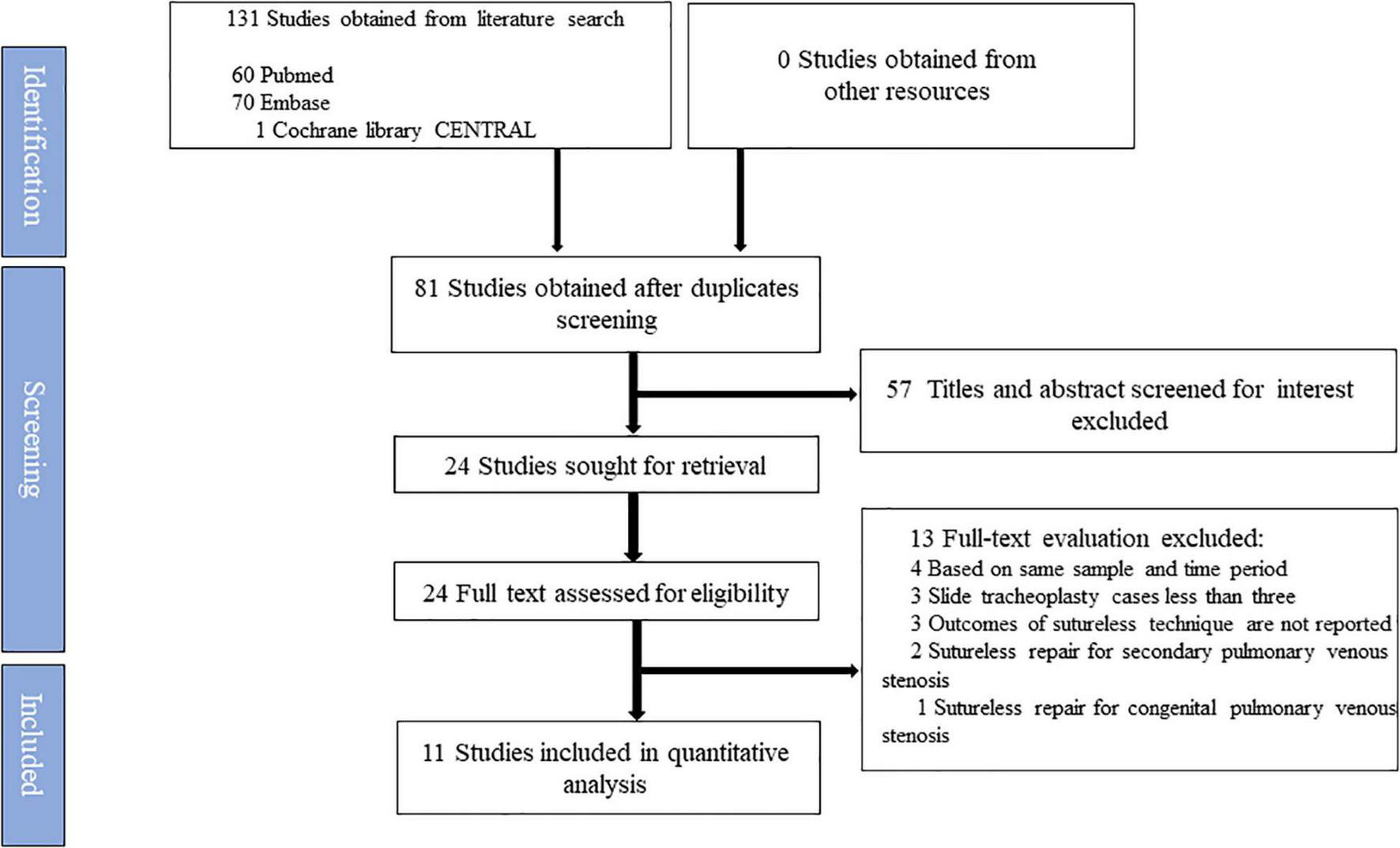 We included a study in this meta-analysis when any one of the following criteria was met: (1) single-arm case series reporting clinical outcomes regarding the primary use of sutureless technique for patients with TAPVC; (2) two-arm case-controlled studies, cohort studies, or randomized controlled trials (RCTs) comparing the sutureless technique with conventional surgery for TAPVC.