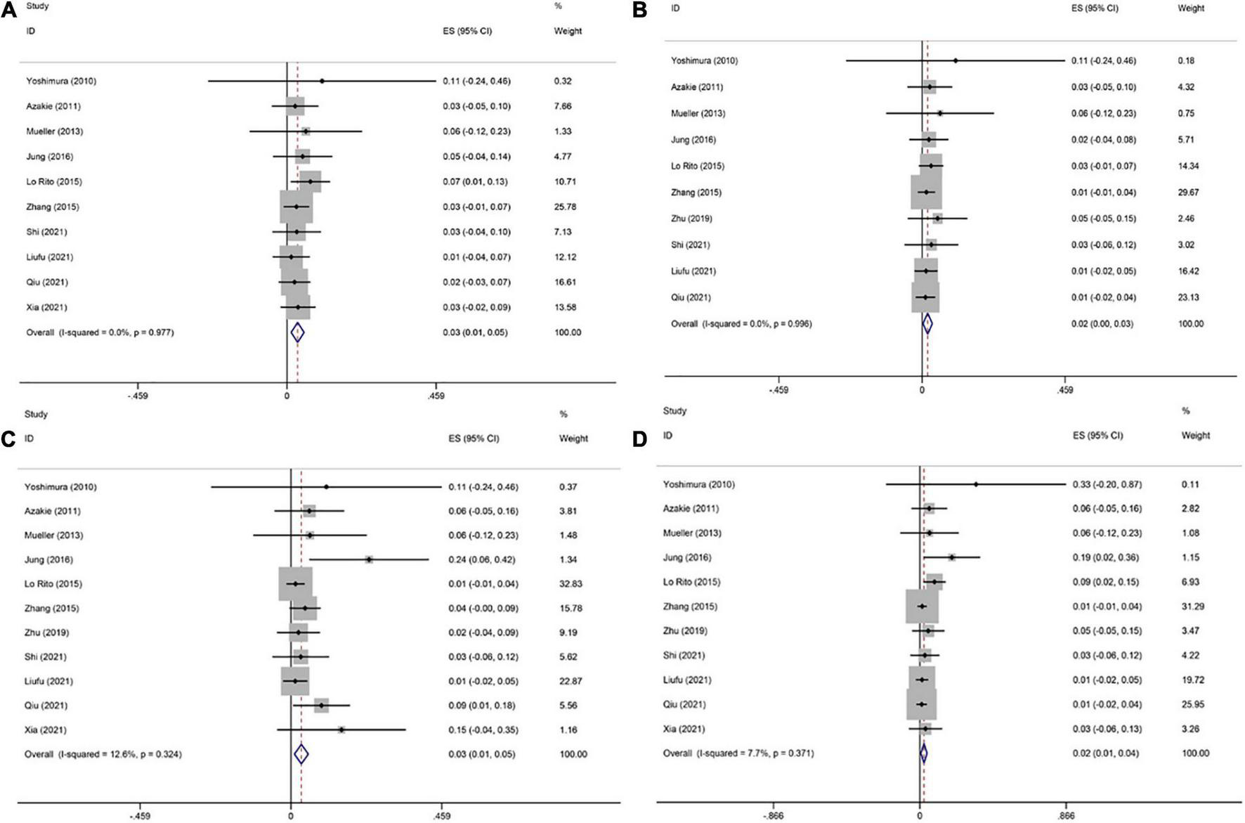 One study (20) did not report postoperative PVO following the sutureless repair, therefore this meta-analysis was based on 10 studies (8, 14–19, 21–23). The pooled estimate of postoperative PVO was 3.3% [95% confidence interval (CI), 1.3–5.3%; I2 = 0; Figure 3A] following the sutureless repair.