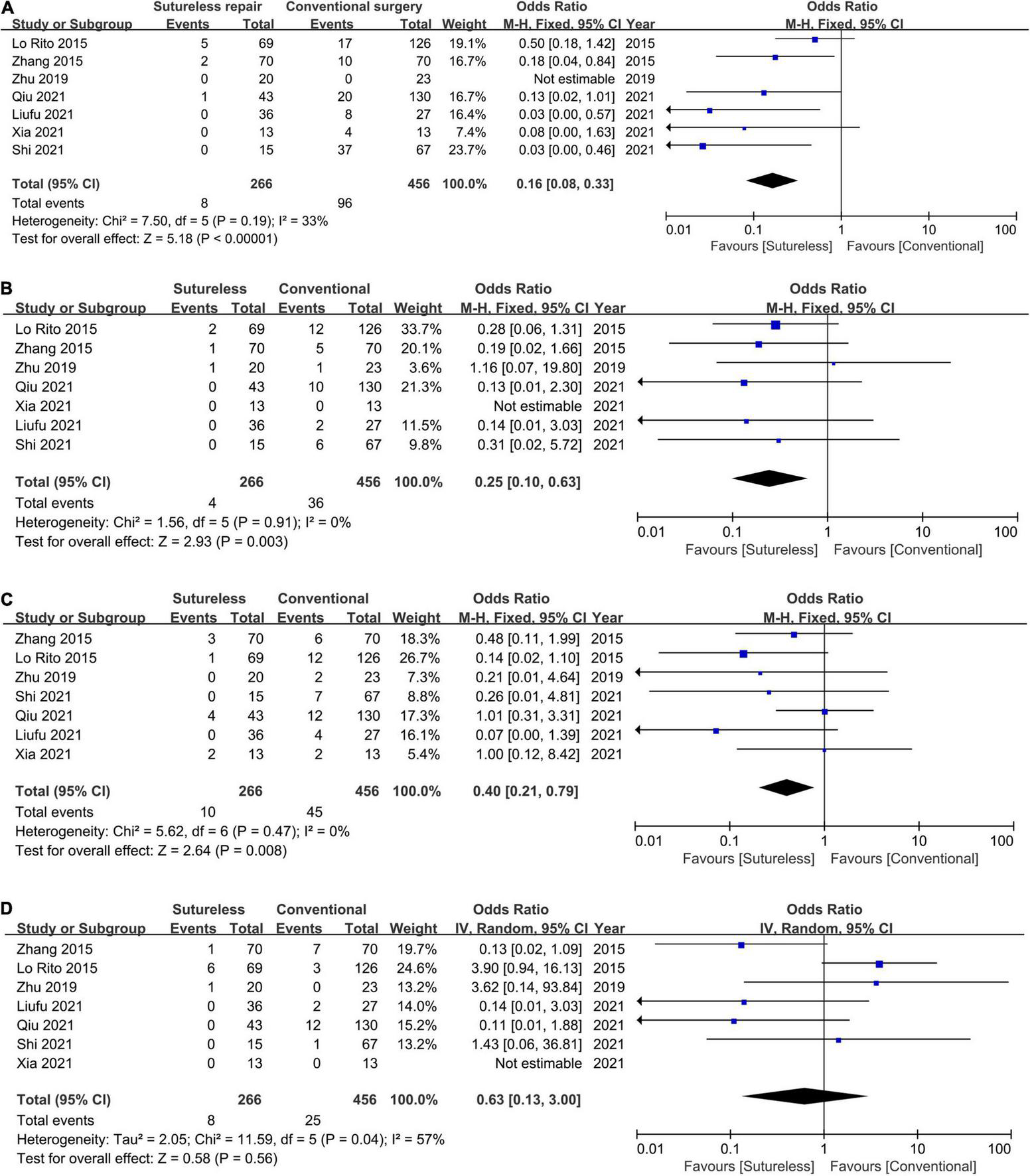 To compare the clinical outcomes of the sutureless technique versus conventional surgery, we included two-arm case-controlled studies in this setting. The odds ratio (OR) was adopted for dichotomous data. If the I2 statistic was greater than 50%, a randomized-effect model was adopted; otherwise, a fixed-effect model was adopted for data synthesis.