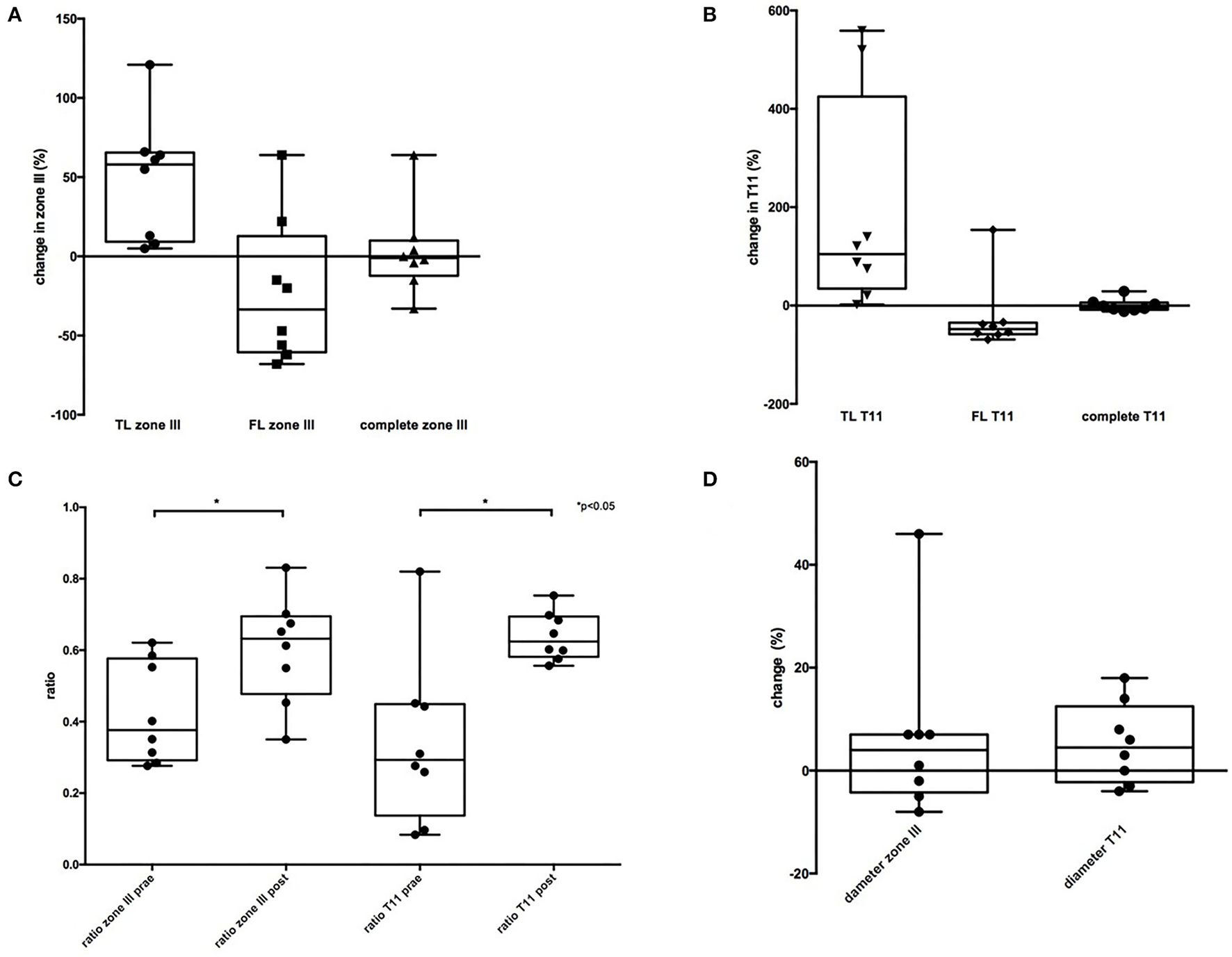 None of the surviving patients (87.5%) showed signs of clinical malperfusion (i.e., stroke, spinal cord injury, and need for dialysis). A postoperative CT scan showed an open TL in all patients. The proportion of TL with respect to total aortic diameter (TL+FL) was postoperatively significantly higher in zone III (p = 0.016) and at the level of T11 (p = 0.009). The mean area of TL+FL was comparable between pre- and postoperative CT-scan (p = n.s.). One patient with preoperative resuscitation died of multiple organ failure on extracorporeal life support on postoperative day 3.
