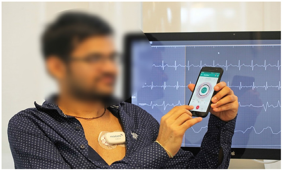 Data collection setup: (i) a chest-mounted single channel wireless ECG monitor collecting ECG and inertial (movement) measurements, and (ii) the mCardia mobile application for collection of patient-reported data (28).