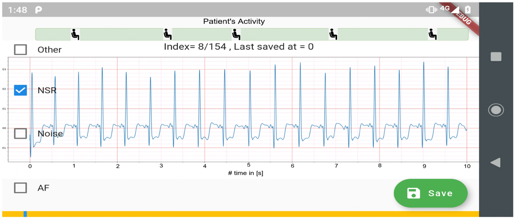 Figure 2 shows the process used for annotating the ECG samples in the CACHET-CADB. A DL based AF detection model (25) was used to process the raw ECG recording. The AF onset and offset timestamps marked by the DL model were stored in CSV files. Thereafter, the segments between the onset and the offset were chopped into 10 s interval recordings and sent to two independent cardiologists for manual annotation via a mobile ECG annotation app. Figure 3 shows the user interface of the ECG annotation app used for the manual annotation. The annotation rules were discussed and agreed upon by the two cardiologists. A 10 s segment was assigned a label if it contained more than 50% of a particular rhythm type. If there were multiple rhythm classes in 10 s sample without having a majority (≥50%) of a particular class, then it was annotated as “others.” If artifacts in the 10 s signal precluded proper interpretation of the underlying rhythm, then the sample was annotated as “noise.” The annotations of the two independent cardiologists were compared for inter-observer agreement. If there were disagreement between the two cardiologists, the annotations were discarded. Thus, the final database only includes samples where there is an agreement between the two cardiologist's annotations.