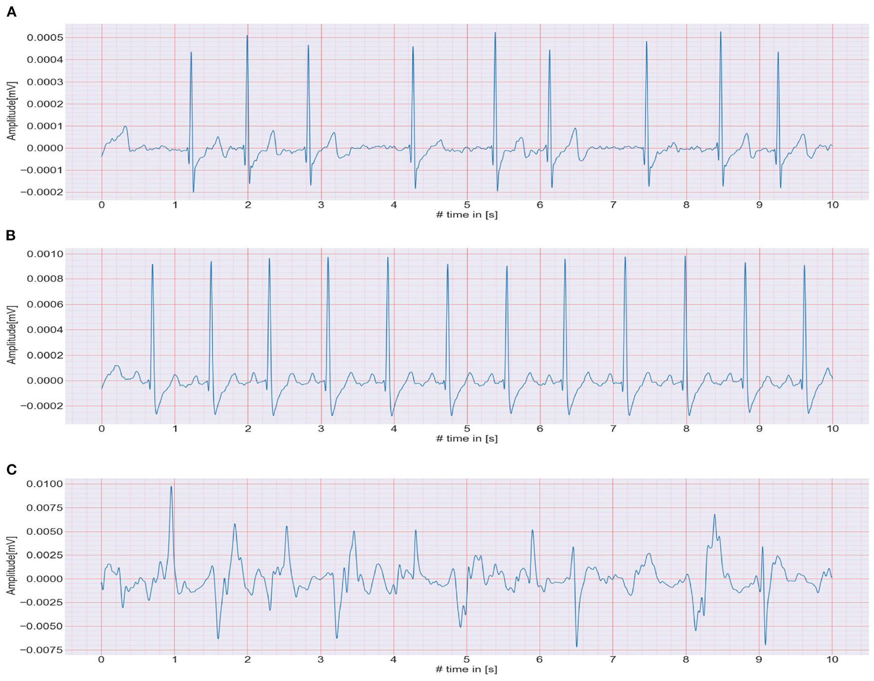 (A–C) Show the 10 s ECG recordings of AF, NSR, and Noise classes, respectively.