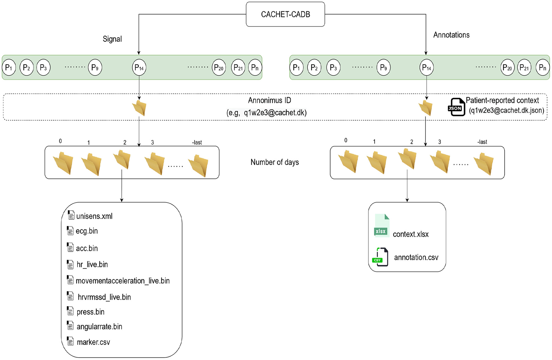 The structure of the data records in CACHET-CADB. Overall, the database is divided into two major parts; (i) the raw recordings in binary files and (ii) the contextual information including patient-reported data and the annotations. Each record is organized according to patient ID first and day in study subsequently.