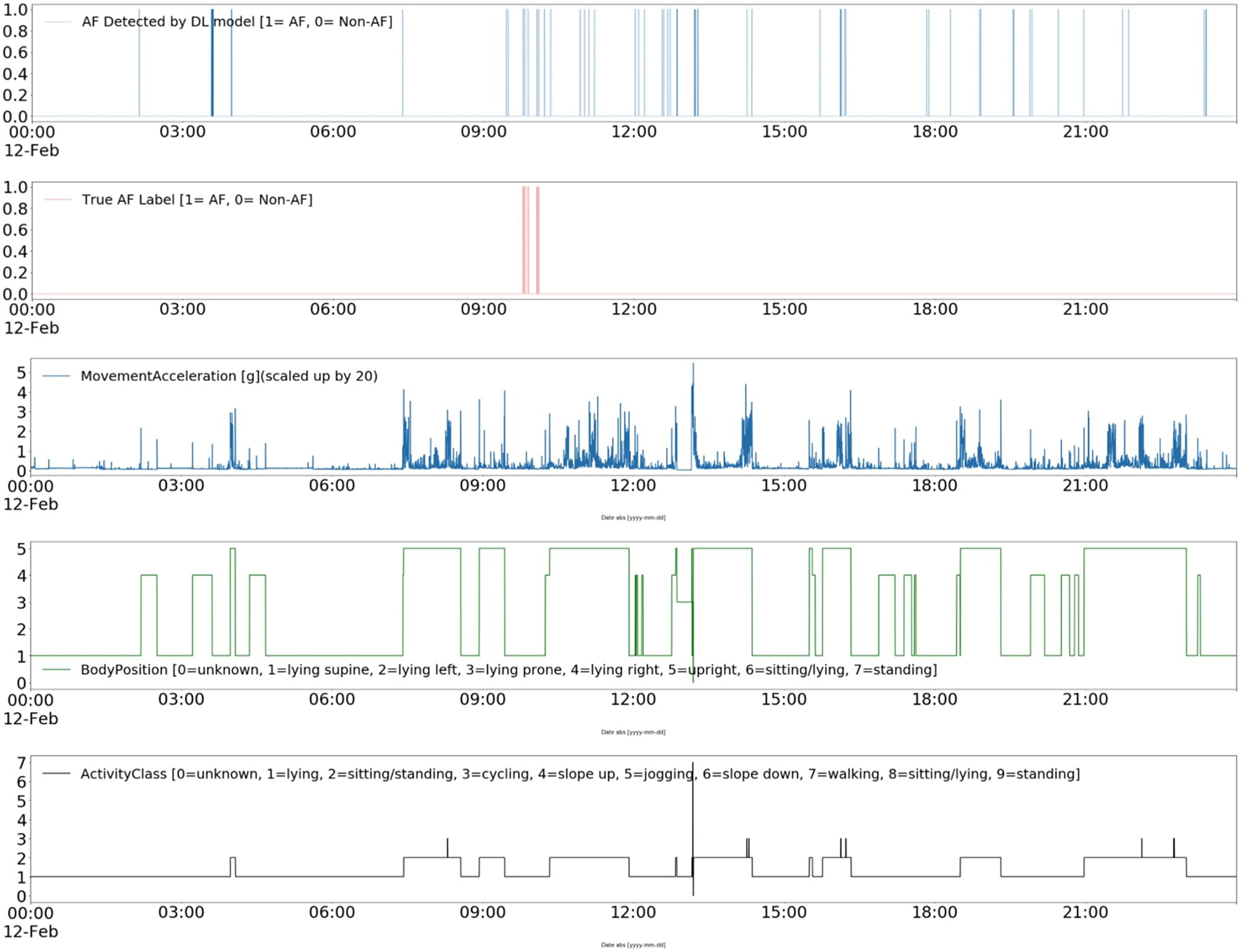 Patient-reported contextual data was collected when the patient manually enters data during the study period. We collected two types of patient-reported context information; (1) experienced events, and (2) daily health reports. The events were registered by patients when they experienced any unusual symptoms (e.g., palpitations, heartburn, etc.) during the ECG recording period. It includes details about the type of symptom, its duration, activity during the symptom, and a short note providing more context and experience. Health reports were provided daily and comprised of a three short survey on meals (timings and type of meal (light, heavy, moderate), self-perceived stress level, and sleep quality (on a scale of 1–5). It should be noted that we only collected food intake timings and quantity (as light, heavy, or moderate) and not the specific details of what patients ate in their meals. The description of the meal itself was optional in the freestyle text input. The freestyle comments added by patients for further describing the symptoms or events were either in English or in the local vernacular language.