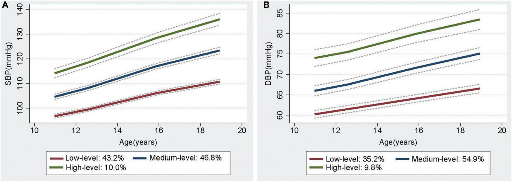 Three trajectories of BP from childhood to youth were identified, and each of the trajectories was labeled on the basis of their BP patterns over time, namely, low-, medium-, and high-level BP trajectories (Figure 1A and Supplementary Table 2). For the SBP trajectories, 43.2% (n = 889) of participants began with a low SBP, which increased from 1987 to 1995, but only up to around 110 mmHg (referred to as low-level group). Meanwhile, 46.8% (n = 1021) of the participants were measured with an SBP of 100–110 mmHg and manifested rapid BP increase over the 8-year period that remained < 125 mmHg (referred to as the medium-level group). Lastly, 10.0% (n = 172) commenced at high levels and experienced the highest increase in SBP throughout the observation period (referred to as the high-level group). Meanwhile, the three DBP trajectories were low-level (35.2%), medium-level (54.9%), and high-level (9.8%). The trajectories differed at the baseline and increased over time (Figure 1B and Supplementary Table 3). In addition, three trajectories of MAP and pulse pressure (PP) were also found in this population (Supplementary Figure 2).