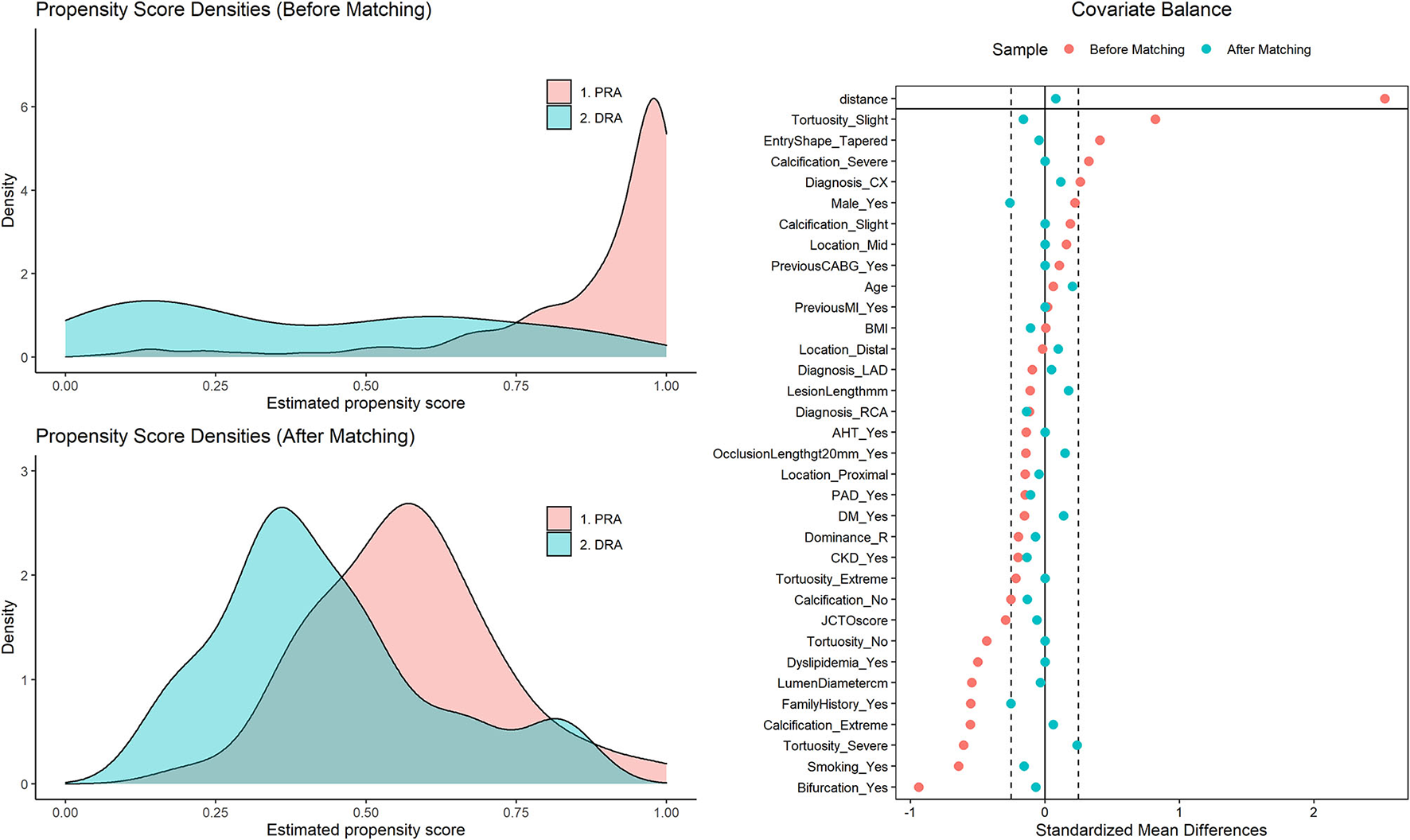 Validation of propensity score matching. (Left) Density of propensity scores for cases in the PRA and the DRA group before and after matching. The propensity scores represent the probability for each patient of belonging to the PRA group. The overlapping area represents patients with similar propensity scores available for close matches. (Right) “Love Plot” illustrating the covariate balance created in the propensity score matched sample. The standardized mean differences comparing covariates between the PRA and DRA groups are shown both in the original sample and after propensity score matching. While there were relevant differences (>25%) in covariates between both groups in the original sample, after matching all are <25%, indicating balance between cases in the PRA and DRA groups for all relevant covariates. DRA, distal radial access; PRA, proximal radial access.