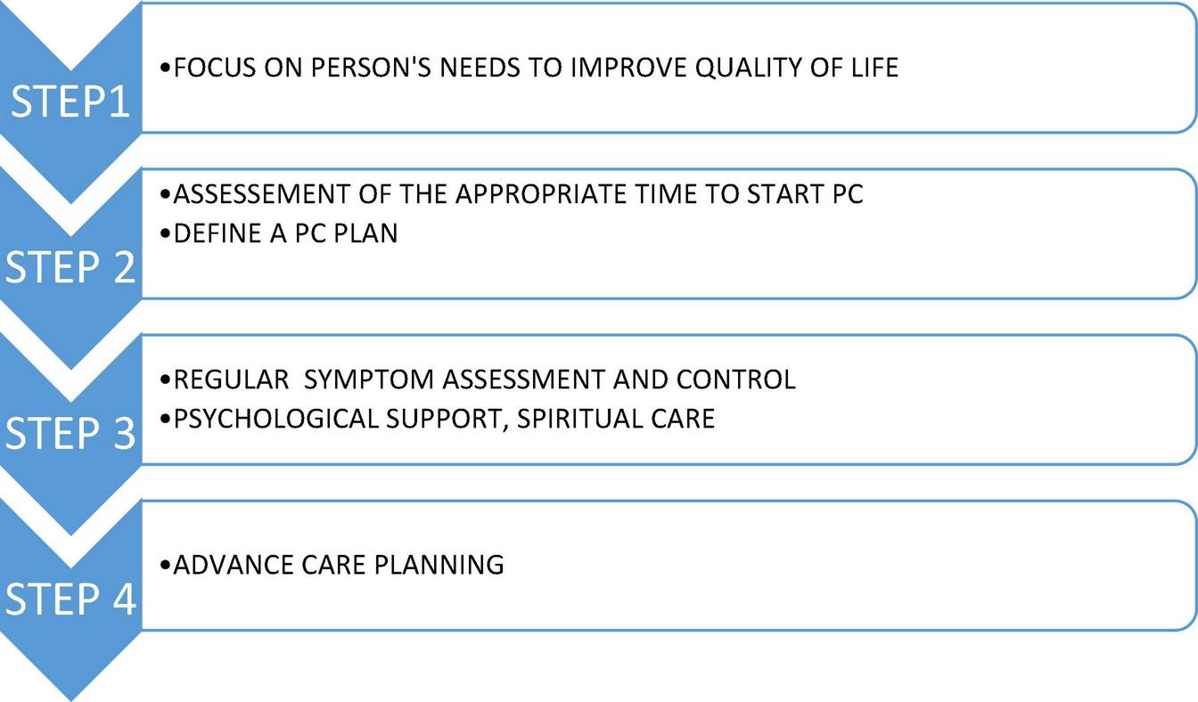 Every person with needs has a right to get access to PC and pain as well as other symptom relief. To realize this, governments should facilitate integration of PC in healthcare systems and healthcare insurances need to reimburse the service (136, 137). PC can be provided on two levels: PC approach (called as well generic PC) and specialist PC (13). In case of PC approach, all healthcare professionals used to be engaged in the management of the person living with a disease implement basic PC principles in the care they usually provide, in a place the person has been cared for so far (e.g., general hospitals, cardiology or pulmonology units, outpatients clinics, and nursing homes). The specialist PC is provided by healthcare professionals having special training, provision of PC is their main business, this level of care should be provided to people with complex needs, or PC approach has appeared as not enough sufficient. Specialist PC should optimally be served by multiprofessional team, but acceptable can be engagement of physician and nurse with PC expertise cooperating with such a team (138). In many countries, there are also hospital PC support teams, providing an advisory service to hospital staff (139).