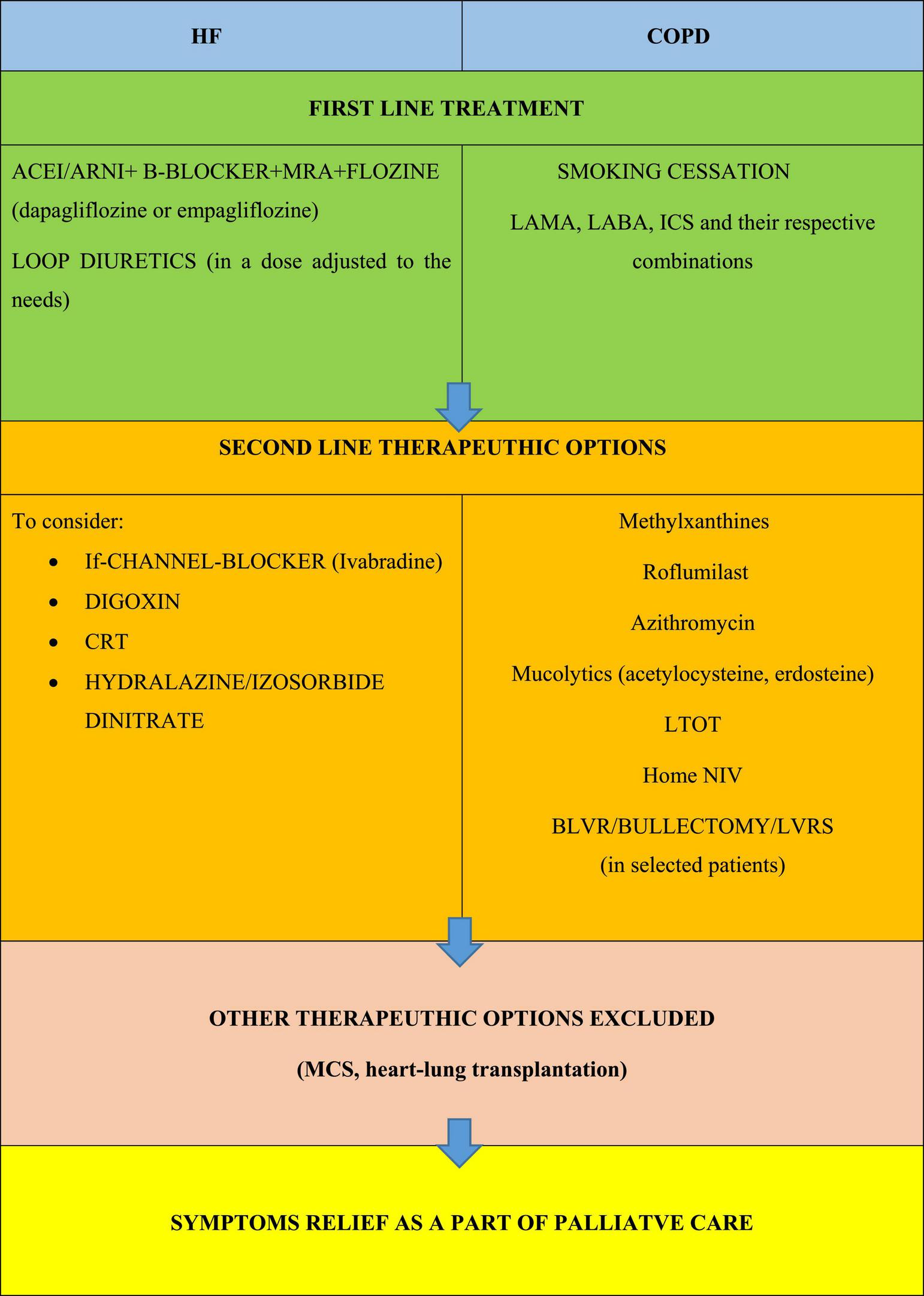 Principles of optimizing the treatment of the underlying disease in people living with COPD and HF; based on (1–3). ACE, angiotensin converting enzyme inhibitor; ARNI, angiotensin receptor neprilysin inhibitor; BLVR, bronchoscopic lung volume reduction; COPD, chronic obstructive pulmonary disease; CRT, cardiac resynchronisation therapy; CS, corticosteroids; HF, heart failure; ICS, inhaled glucocorticoids; LABA, long acting B2 agonist; LAMA, long acting muscarinic antagonist; LTOT, long term oxygen therapy; LVRS, lung volume reduction surgery; MCS, mechanical cardiac support; MRA, mineralocorticoid receptor antagonist; NIV, non-invasive ventilation; PDE-4, phosphodiesterase-4; SABA, short acting β agonist.