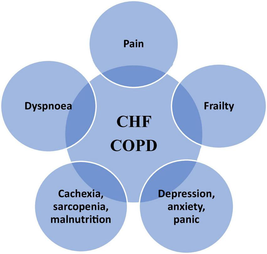 Cardiovascular diseases (CVD) and respiratory diseases are the leading causes of morbidity and mortality in developed countries (1, 2). Among them, chronic heart failure (CHF) and chronic obstructive pulmonary disease (COPD) are regarded as the most common. Both diseases may cause serious clinical, social, and economic burden (1, 2). Heart failure (HF) affects up to 4% of the global population, and the number of new cases is constantly rising (1–3). The causes of this phenomenon are associated mostly with aging of the society and, paradoxically, with the improved survival in HF and acute coronary syndromes being one of common causes of HF (1). COPD is currently the third leading cause of death worldwide (2, 4). As smoking, which is a major risk factor for the development of COPD, as well as for coronary artery disease, is still widespread in the population, particularly of low and moderate incomes, an upward trend in the number of new cases of COPD is still predicted (2, 4). CHF and COPD having similar risk factors coexist in about 30% (range 9–52%) (2, 5, 6). If CHF and COPD coexist, the function of many organs and systems is affected more profoundly, the symptoms overlap, the quality of life (QoL) is limited more seriously, and the mortality risk is higher, particularly in the elderly (1, 2, 7). CHF increases mortality risk in people with COPD and CVD being the most common cause of death among this population, but the influence of COPD on all-cause mortality in the HF has not been proven so far (8, 9). The management of people living with CHF and COPD needs to address similar problems and symptoms and to prevent recurrence of exacerbations of these diseases (1, 5, 6). The guidelines recommend implementation of disease-specific management for HF and COPD even in the most advanced stages of disease. Interestingly, most of them recommend care provided by multidisciplinary team, including palliative care (PC), if needed (1–3, 10, 11).