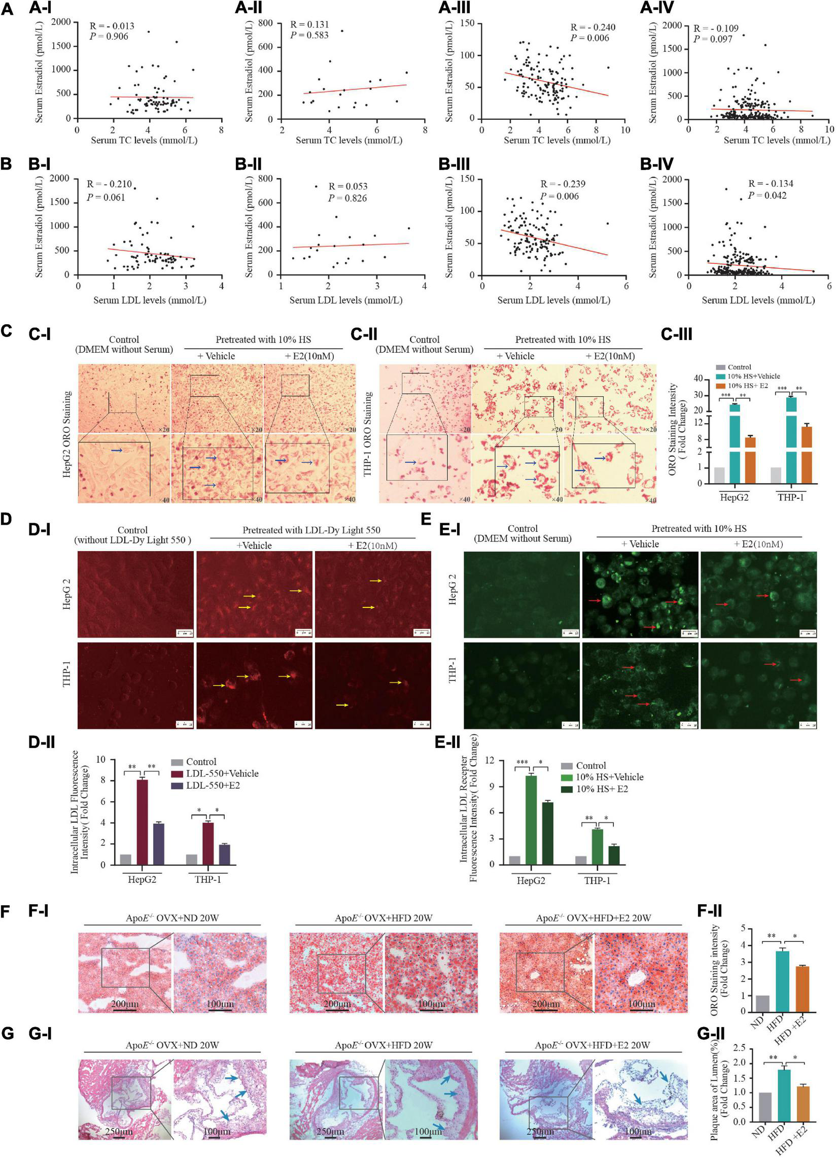 Estrogen affects lipid metabolism in vivo and in vitro. (A,B) A total of 231 healthy women (21–70 years) who experienced natural menstrual states were recruited. Correlation of serum 17-β estradiol [estrogen (E2)] levels and TC in premenopausal (AI) (n = 80), perimenopausal (AII) (n = 20), postmenopausal (AIII) women (n = 131), and all female participants (AIV) (n = 231); correlation of serum E2 levels and LDL-C in premenopausal (BI) (n = 80), perimenopausal (BII) (n = 20), postmenopausal (BIII) (n = 131) women and all female participants (BIV) (n = 231); (C) In order to build an in vitro foam-cell environment to mimic the postmenopausal state, mixed hyperlipidemic serum (HS) from post-menopause females (n = 26) were used to pretreat HepG2 cells and THP-1 macrophages. After stimulated by 5% FBS and 10% HS with or without E2 treatment for 24 h, intracellular lipid accumulation in vitro was measured by the ORO staining assay. Representative images from at least three independent experiments are presented (CI). Total area of lipid droplets normalized to cell number (n = 5∼8 cells/field/slice, n = 3 slices/group) was determined using Image J software and shown in (CII). (D) HepG2 cells and THP-1 macrophages stimulated by fluorescence labeling LDL (LDL-Dy Light 550) were treated with vehicle or with E2 (10 nM) for 24 h, Representative fluorescence images of intracellular LDL in HepG2 cells and THP-1 macrophages were shown in (DI). Unstimulated HepG2 cells and THP-1 macrophages were set as controls. Total area of labeling LDL normalized to cell number (n = 10 cells/field/slice, n = 3 slices/group) was determined using Image J software. Representative images from at least three independent experiments are presented (DII). Red light indicates labeling LDL. (E) After labeling LDL visualization (CI), cells were blockade with Cell-Based Assay Blocking Solution for 30 min and stained with rabbit anti-LDL receptor primary antibody and DyLight 488-conjugated secondary antibody. The cells were then subjected to microscopic analysis for detection of LDLR expression, which are indicated by green light. Total area of LDLR expression normalized to cell number (n = 10 cells/field/slice, n = 3 slices/group) was determined using Image J software and shown in (EII). (F) Eight-week-old ApoE–/– mice were subjected to ovariectomy. Seven days later, they were randomized to three groups: normal diet (NF) group (n = 5), high-fat diet (HFD) group (n = 5), or HFD + E2 (1 μg/kg/day) administration group (n = 5). Treatments continued for 20 weeks until euthanasia. After euthanasia, liver tissue were prepared as rapid freezing section and subjected to ORO staining for detection of lipids accumulation. Representative images of liver ORO staining are shown (FI) (n = 3 sections/mouse/group, n = 5 mice/group). Densitometric quantification was conducted using Image J and values are expressed as the fold change compared with control and are presented as mean ± SEM (n = 5 mice/group). (G) Heart tissue were prepared as rapid freezing section and subjected to H&E staining for detection of plaque area of the three groups of mice (n = 3 sections/mouse/group, n = 5 mice/group). Densitometric quantification was conducted using Image J and values are expressed as the fold change compared with control and are presented as mean ± SEM (n = 5 mice/group). Student’s t-test was used to evaluate the significance in differences between two groups of observations, *P < 0.05; **P < 0.01; ***P < 0.001. E2, 17β-estradiol; HS, hyperlipidemic serum from postmenopausal women; LDL, low-density lipoprotein; LDLR, LDL receptor; OVX, ovariectomized; TC, total cholesterol; TG, triglycerides; HDL-C, high-density lipoprotein-cholesterol; LDL-C, low-density lipoprotein-cholesterol; ORO, Oil red O; OVX, ovariectomy.