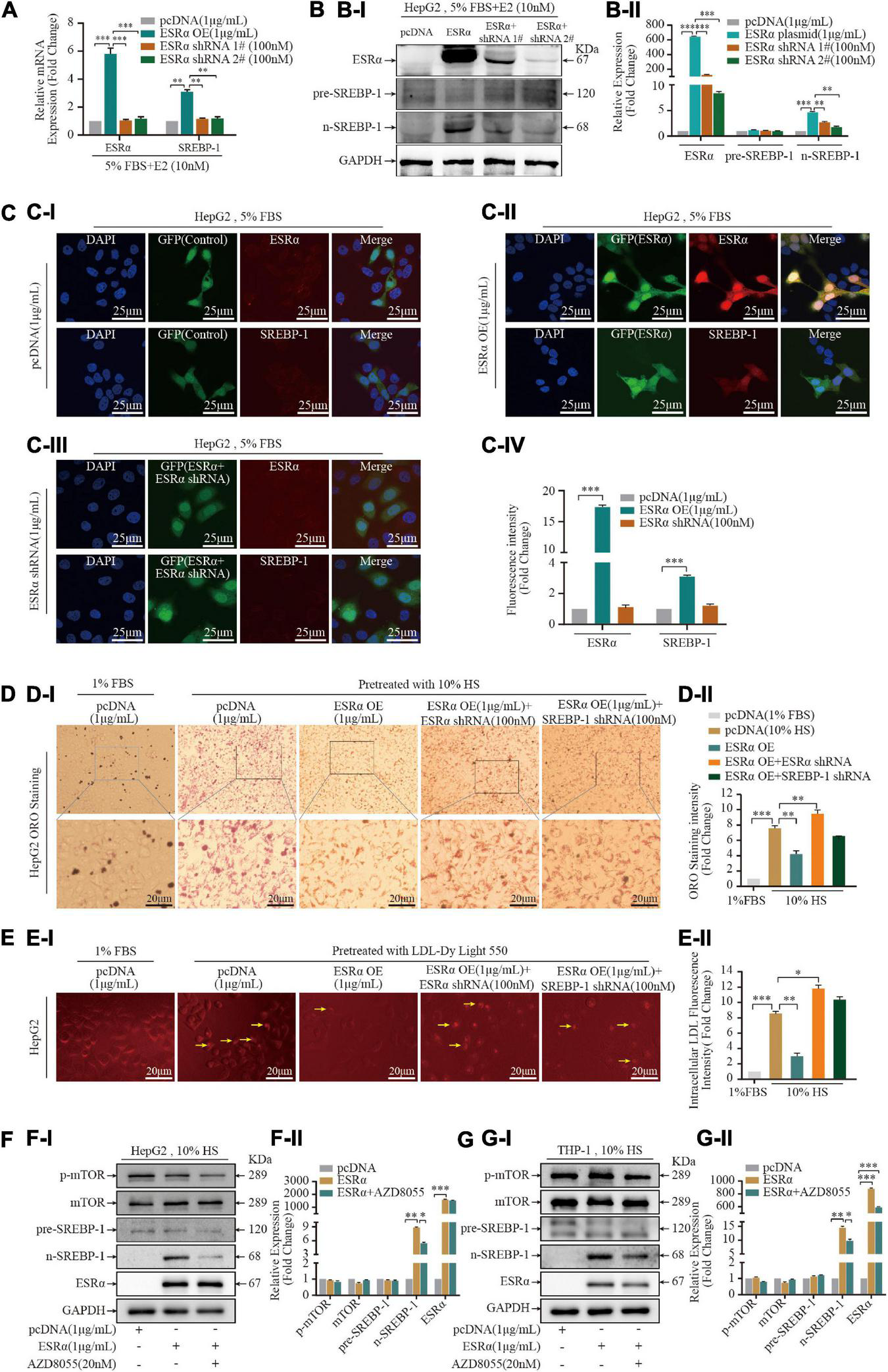 E2/ESRα regulates SREBP-1 expression. (A–C) HepG-2 cells were cultured for 7 days in phenol red-free medium supplemented with 5% FBS, cells were transfected with pcDNA control, ESRα, ESRα and ESRα shRNA, after gene transfection, the cells were subsequently cultured with 10 nM E2 for 48 h and harvested for RT-qPCR (A), western blotting (B), and immunofluorescence (C) to detect the mRNA and protein expression alteration of ESRα, pre-SREBP-1 and n-SREBP-1. immunofluorescence was visualized under confocal microscopy; DAPI stains the nucleus (blue), ESRα (green) (n = 5∼8 cells/field/slice, n = 3 slices/group). (D) Representative ORO staining (DI) and quantification (DII) of red dot intensity in HepG2 cells after interference with pcDNA control, ESRα, ESRα & ESRα shRNA, and ESRα & SREBP-1 shRNA plasmid. (E) Representative images (EI) and quantification (EII) of intracellular LDL in HepG2 cells after interference with pcDNA control, ESRα, ESRα and ESRα shRNA, and ESRα and SREBP-1 shRNA plasmid. Red: DyLight 550-marked LDL. (F,G) After gene transfection, HepG2 and THP-1 cells were subsequently cultured with or without p-mTOR inhibitor AZD8055 (20 nM) for 48 h, cells were harvested for western blotting, representative blotting images (FI,GI) and quantification (FII,GII) of mTOR, p-mTOR, pre-SREBP-1 and n-SREBP-1, and ESRα. Data illustrated on the bar graph are the mean ± SD. All representative images presented were repeated in three independent experiments. Student’s t-test was used to evaluate the significance in differences between two groups of observations, *P < 0.05; **P < 0.01; ***P < 0.001.