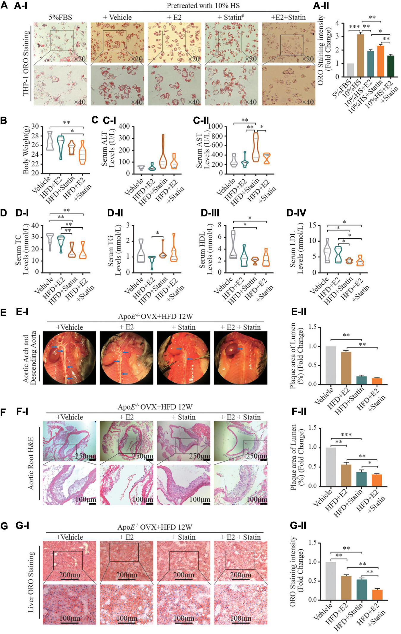 Estrogen enhanced statin sensitivity both in vivo and in vitro. (A) HepG2 cells and THP-1 macrophages stimulated by 5% FBS and 10% HS with or without E2 treatment for 24 h, intracellular lipid accumulation in vitro was measured by the ORO staining assay. Representative ORO staining (AI) and quantification (AII) of red dot intensity in THP-1 cells after treatment with dissolving medium, E2, rosuvastatin, or E2 + rosuvastatin in the presence of 10% HS. FBS (5%)-treated THP-1 cells were set as the negative control (n = 10∼20 cells/field/slice, n = 3 slices/group). (B) Eight-week-old ApoE–/– mice were subjected to ovariectomy. Seven days later, they were randomized to three groups: high-fat diet (HFD) group (n = 8); HFD + E2 (0.25 mg/kg/day) (n = 8); HFD + rosuvastatin (5 mg/kg/day) (n = 8); HFD + E2 (0.25 mg/kg/day) + Rosuvastatin (5 mg/kg/day) (n = 8). Treatments continued for 20 weeks until euthanasia. Bodyweights of mice at time of euthanasia were shown in violin plots. (C) After euthanasia, peripheral blood was collected from the abdominal aorta. Violin plots show the distribution of serum concentration of alanine aminotransferase (ALT) (CI), aspartate aminotransferase (AST) (CII). (D) Violin plots show the distribution of serum concentration of TC (DI), TG (DII), HDL-C (DIII), and LDL-C (DIV) of the four groups of mice (n = 8 mice/group). (E) Representative photomicrographs (EI) and quantification of plaques in the lumen (EII) of en face aortic arch and descending aorta of the four groups of mice (n = 8 mice/group). (F) Aortic roots were prepared as rapid freezing sections and subjected to H&E staining for detection of plaque area of the three groups of mice. Representative images of H&E staining (FI) of the aortic root and plaque area (FII) of the four groups of mice (n = 3 sections/mouse/group, n = 8 mice/group). (G) Liver tissue were prepared as rapid freezing section and subjected to ORO staining for detection of lipids accumulation. Representative images of liver ORO staining are shown (GI) (n = 3 sections/mouse/group, n = 8 mice/group). Densitometric quantification was conducted using Image J and values are expressed as the fold change compared with control and are presented as mean ± SEM (n = 8 mice/group). Student’s t-test was used to evaluate the significance in differences between two groups of observations, *P < 0.05; **P < 0.01; ***P < 0.001.