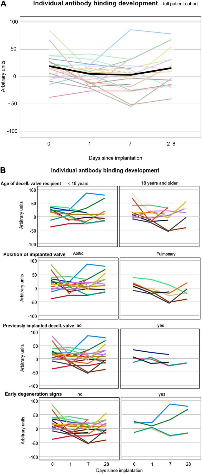 (A) Individual antibody binding of each patient against 12 solubilized decellularized valves. The lines connect the averages of all triplicate medians, displayed as arbitrary units, of each patient. The black line shows the average antibody binding of the whole study cohort at the respective time points. (B) Individual antibody binding for all 20 patients differentiated by age, valve position, prior DHV implantation, and echocardiographic signs of early degeneration. Broken lines indicate the patient post-lung transplantation.