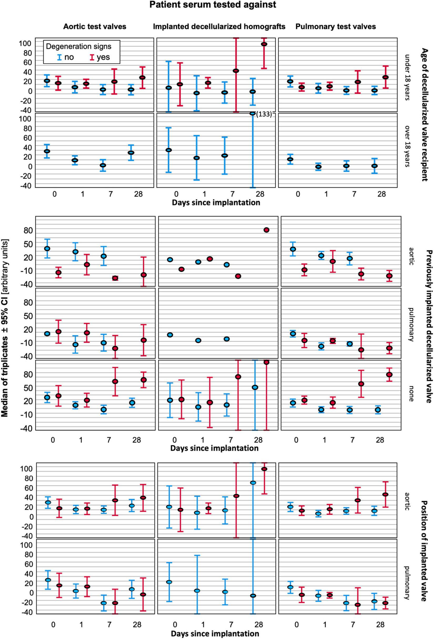 Antibody binding to implanted DHV (middle column) and test valves (left column-aortic, right column pulmonary) differentiated by age (superior block), valve position (middle block), and prior DHV implantation (inferior block). In each graph, the results for patients with signs of early degeneration are marked in red, and blue indicates no degeneration at the last follow-up.
