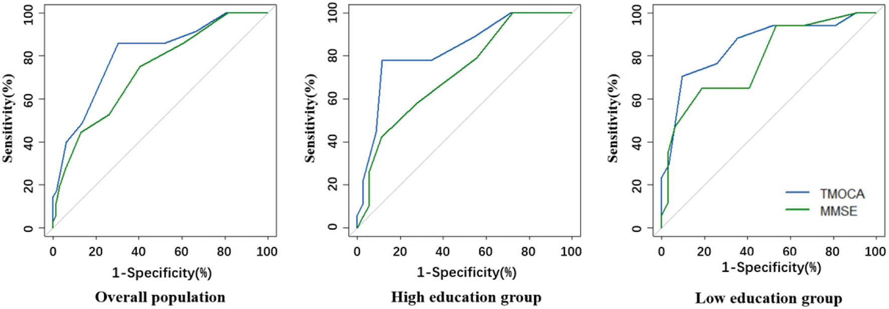 The AUCs of MMSE were 0.75 (0.63–0.83), 0.72 (0.58–0.85), and 0.80 (0.64–0.92) in the overall study population, in patients with a high educational level, and in patients with a low educational level respectively, not significantly different with that of T-MoCA (Figure 2). The optimal sensitivity (74.2%) and specificity (62.1%) of MMSE for screening MCI were achieved at a threshold of 27/28 in the overall population. A sensitivity of 64.7% and a specificity of 86.7% were achieved in patients with a low educational level at an optimal threshold of 25/26. However, the sensitivity is too low for MMSE to be a screening tool in the high educational level group (Supplementary Table 2).
