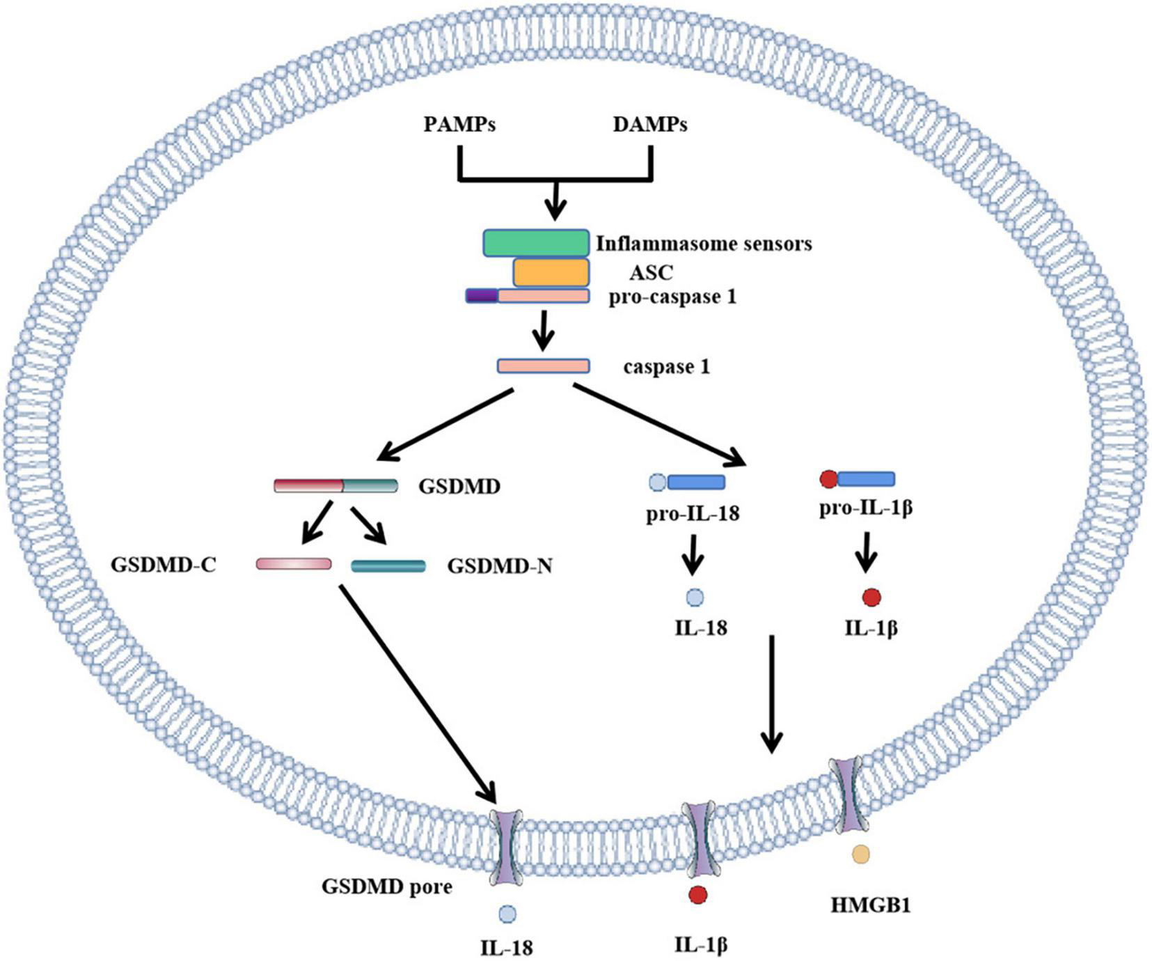 Role of GSDMD in canonical inflammasome activation. The canonical pathway of pyroptosis. PAMPs or DAMPs bind to inflammasome to activate caspase-1, cleaving GSDMD to form GSDMD-C and GSDMD-N. GSDMD-N cluster and bind to the plasma membrane to form GSDMD pores. Simultaneously activated caspase-1 activates IL-18 and IL-1β, and cytokines IL-18 and IL-1β are released into the cell through the GSDMD pore. In addition to IL-18 and IL-1β, HMGB1 is also removed.