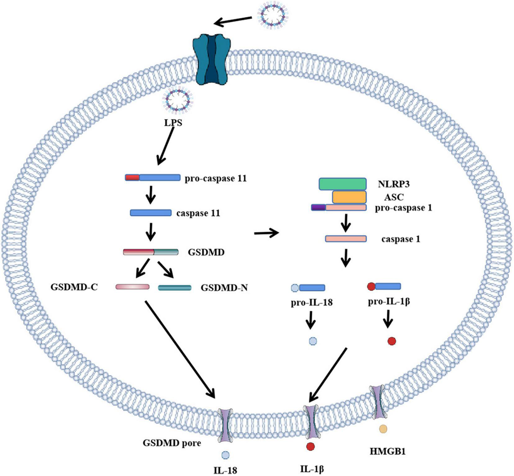Role of GSDMD in non-canonical inflammasome activation. The canonical pathway of pyroptosis. When LPS enters cells, it directly participates in and activates human caspase-4 and caspase-5 and mouse caspase-11. Caspase-11 cleaves GSDMD, forming GSDMD-C and GSDMD-N. GSDMD-N cluster and bind to the plasma membrane. Formation of GSDMD pore, the formation of GSDMD pore activates inflammasome to bind to caspase-1, activated caspase-1 activates IL-18 and IL-1β, and cytokines IL-18 and IL-1β are released extracellularly through GSDMD pore.