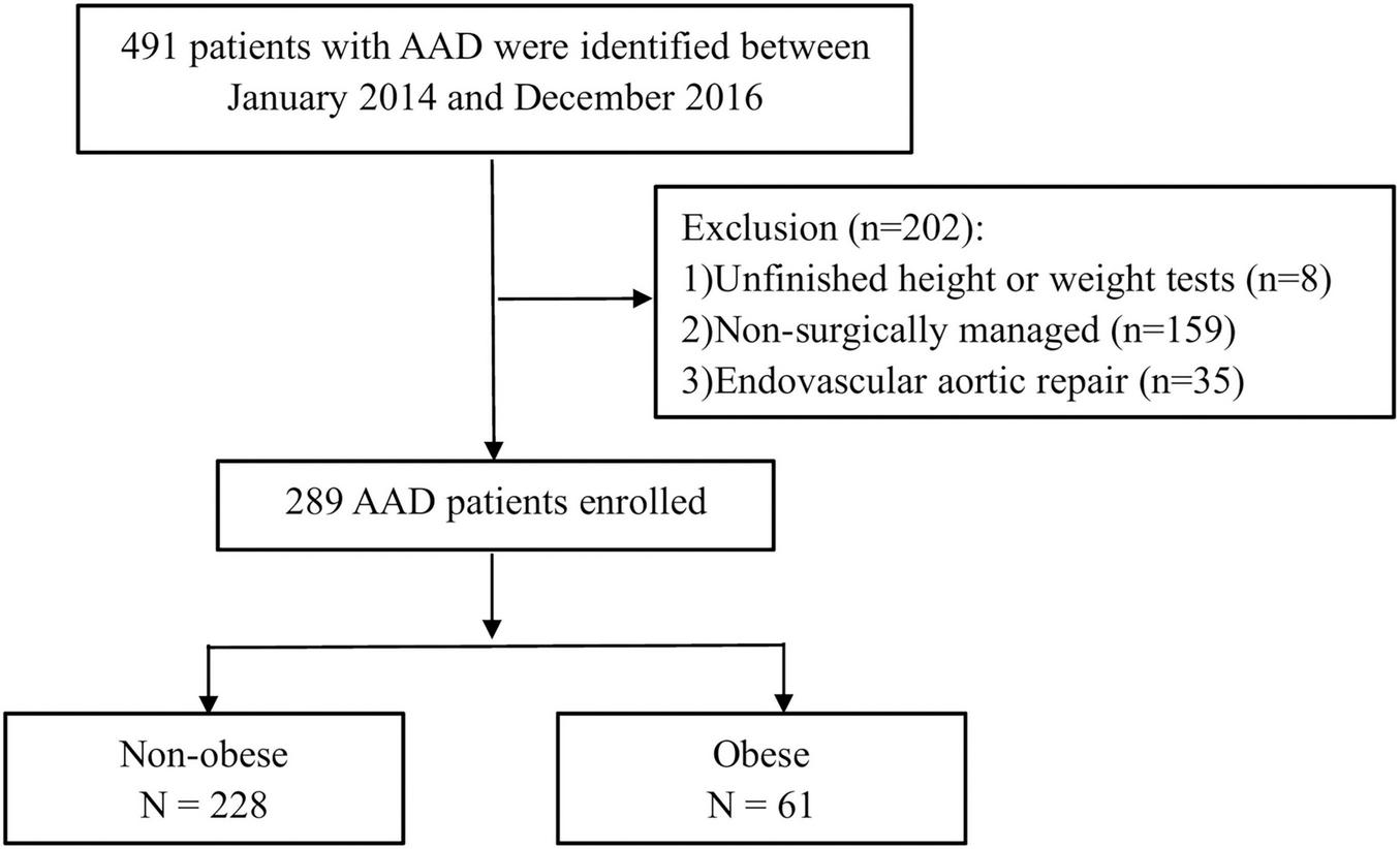 The inclusion criteria were hospital admission for patients with acute type AAD within ≤14 days after symptoms onset. The following were used as exclusion criteria: (1) unfinished height or weight test; (2) non-surgically managed condition; and (3) endovascular aortic repair (Figure 1).